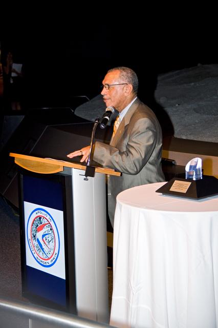 CAPE CANAVERAL, Fla. – At NASA's Kennedy Space Center in Florida, NASA Administrator Charles Bolden addresses guests who have gathered in Kennedy's Visitor Complex to celebrate Apollo astronaut Al Worden's receiving the Ambassador of Exploration Award. Worden is being honored for his contributions to the U.S. space program. The award, to be displayed at Kennedy, is a moon rock encased in Lucite, mounted for public display. Worden served as command module pilot for the Apollo 15 mission, which set several moon records for NASA, including the longest lunar surface stay time, the longest lunar extravehicular activity and the first use of a lunar roving vehicle. Worden spent 38 minutes in a spacewalk outside the command module and logged a total of 295 hours, 11 minutes in space during the mission. NASA is giving the Ambassador of Exploration Award to the first generation of explorers in the Mercury, Gemini and Apollo space programs for realizing America's goal of going to the moon. The rock is part of the 842 pounds of lunar samples collected during six Apollo expeditions from 1969 to 1972. Those astronauts who receive the award will then present the award to a museum of their choice. Photo credit: NASA/Jack Pfaller