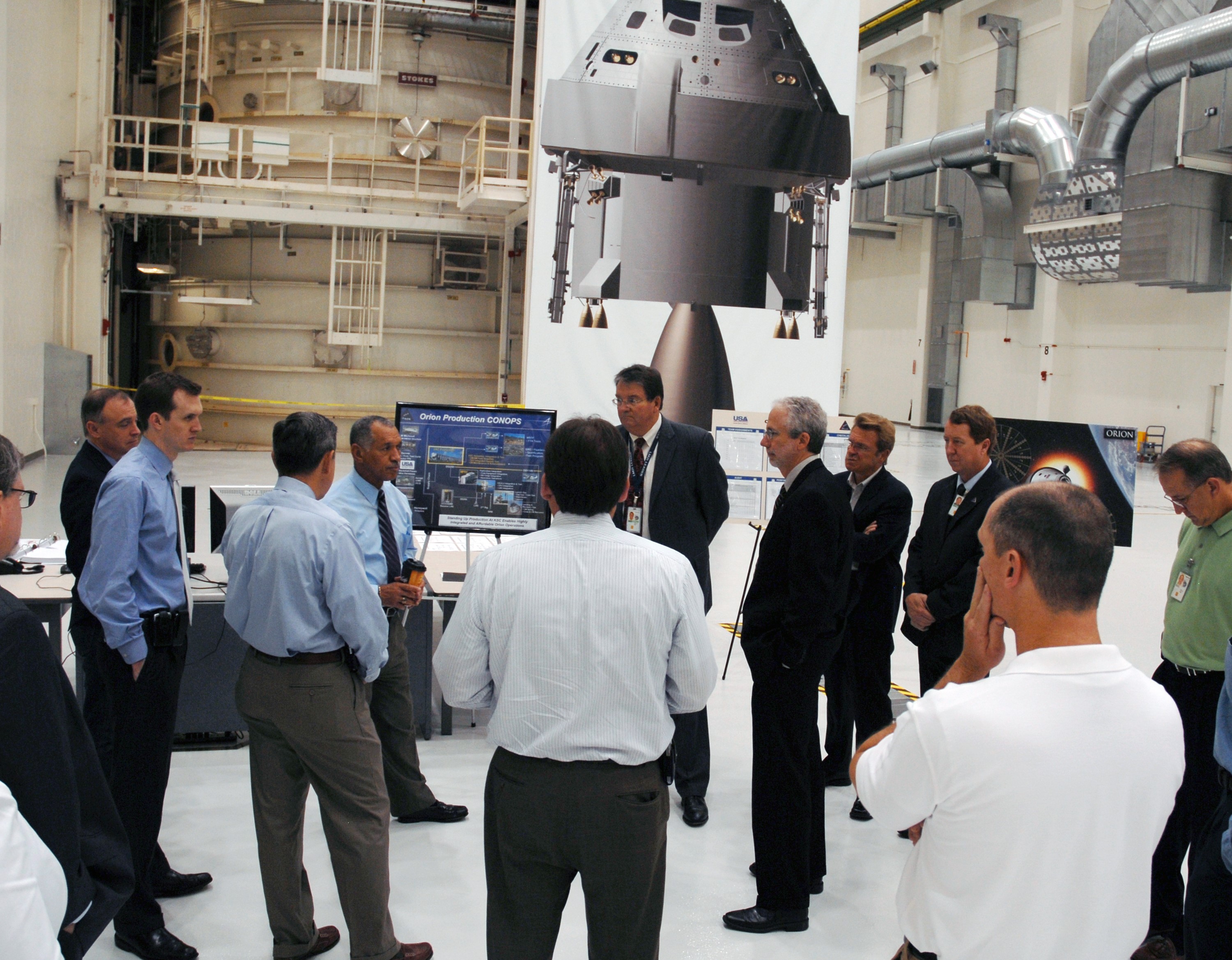 CAPE CANAVERAL, Fla. – On a tour of NASA's Kennedy Space Center in Florida, NASA Administrator Charles Bolden stops in the Operations and Checkout Building to view the high bay planned for the assembly of the Constellation Program's Orion crew vehicle. At left are Chief of Staff in the Office of the Administrator George Whitesides, Center Director Bob Cabana (back to camera) and Bolden. Facing Bolden is Lockheed Martin Space Systems Company Deputy Program Manager Richard F. Harris. Bolden is touring several facilities at Kennedy involved with NASA's Constellation Program. Bolden also was at Kennedy for several events, including the landing of space shuttle Endeavour's STS-127 mission and the signing of the joint NASA-Japan Aerospace Exploration Agency agreement defining the terms of cooperation between the agencies on the Global Precipitation Measurement, or GPM, mission. Photo credit: NASA/Kim Shiflett