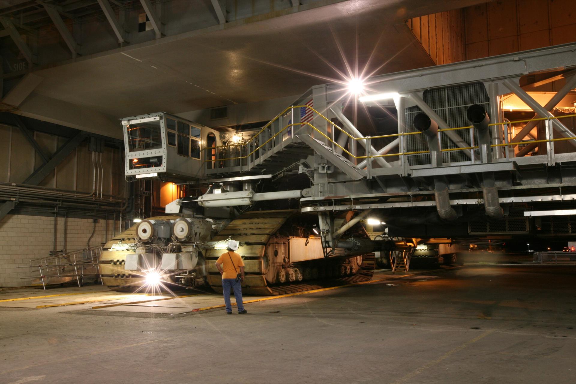 CAPE CANAVERAL, Fla. – Workers in the Vehicle Assembly Building at NASA's Kennedy Space Center in Florida wait patiently by the crawler-transporter for the decision to start rolling space shuttle Discovery to Launch Pad 39A. Rollout was delayed approximately 2 hours due to lightning in the area. First motion out of the Vehicle Assembly Building was at 2:07 a.m. EDT Aug. 4. The 3.4-mile journey was slower than usual as technicians stopped several times to clear mud from the crawler's treads and bearings. Discovery's 13-day flight will deliver a new crew member and 33,000 pounds of equipment to the International Space Station. The equipment includes science and storage racks, a freezer to store research samples, a new sleeping compartment and the COLBERT treadmill. Launch of Discovery on its STS-128 mission is targeted for late August. Photo credit: NASA/Dimitri Gerondidakis