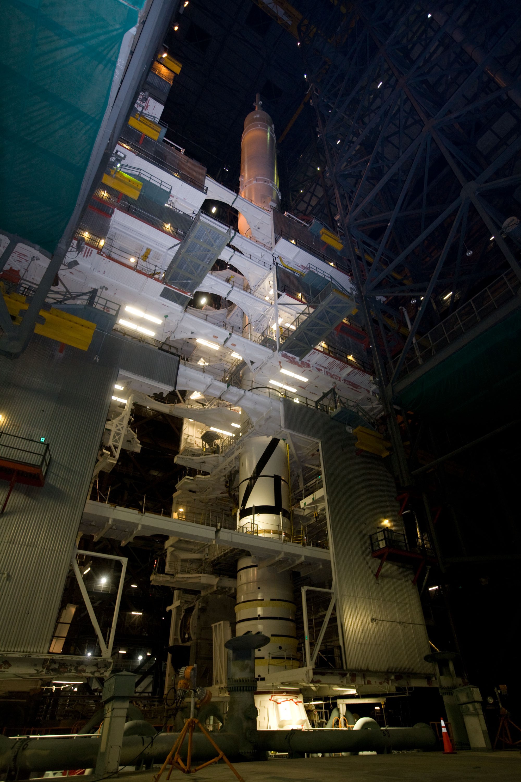 CAPE CANAVERAL, Fla. – In the Vehicle Assembly Building's High Bay 3, Super Stack 5 is secured to the Ares I-X segments already in place on the mobile launcher platform. Assembly of the Ares I-X rocket is complete. The 327-foot-tall rocket is one of the largest processed in the bay, rivaling the height of the Apollo Program's 364-foot-tall Saturn V. Five super stacks make up the rocket's upper stage that is integrated with the four-segment solid rocket booster first stage. Ares I-X is the test vehicle for the Ares I, which is part of the Constellation Program to return men to the moon and beyond. The Ares I-X flight test is targeted for Oct. 31, pending formal NASA Headquarters approval. Photo credit: NASA/Dimitri Gerondidakis