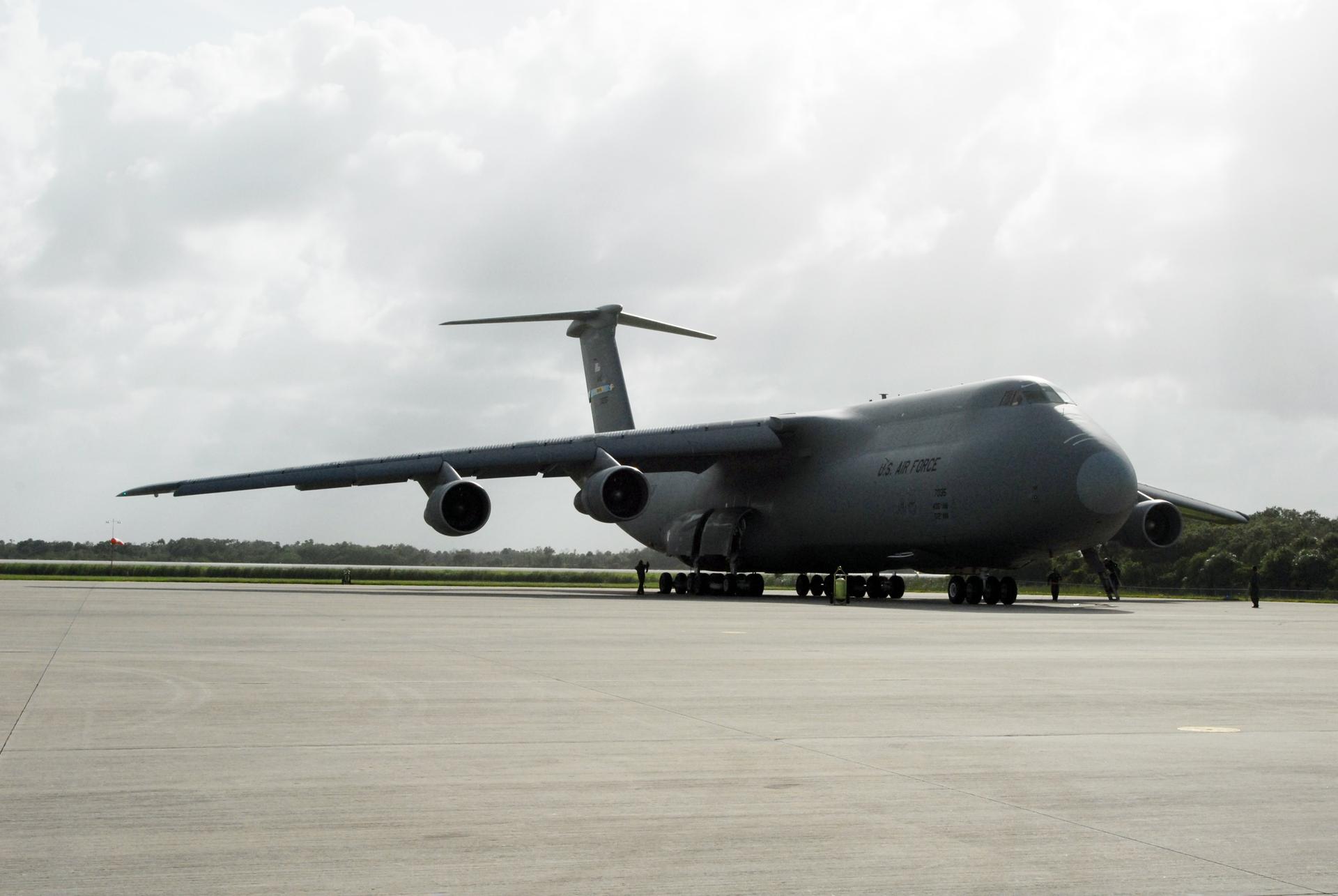 CAPE CANAVERAL, Fla. – The U.S. Air Force C-5 lands on NASA Kennedy Space Center's Shuttle Landing Facility. The aircraft carries the Express Logistics Carrier 4, or ELC4, part of the payload for the STS-133 mission. Space shuttle Endeavour will deliver the ELC4 and ELC3 with critical spare components to the International Space Station on the mission. Endeavour's launch is targeted for late July in 2010. Photo credit: NASA/Amanda Diller
