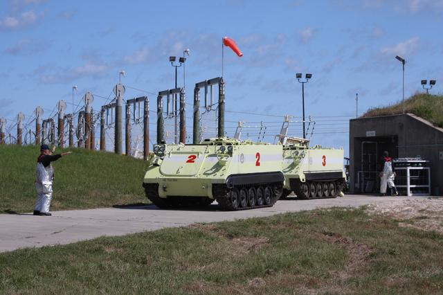CAPE CANAVERAL, Fla. – On Launch Pad 39A at NASA's Kennedy Space Center in Florida, a Mode II-IV exercise is underway. Seen here are M-113 armored personnel carriers near the slidewire basked landing site. Involved in the drill are NASA fire rescue personnel, volunteers portraying astronauts with simulated injuries, helicopters and personnel from the Air Force’s 920th Rescue Wing and medical trauma teams at three central Florida hospitals. The drill allows teams to practice an emergency response at Pad 39A, including helicopter evacuation to local hospitals. The Space Shuttle Program and U.S. Air Force are conducting the emergency simulation. Photo credit: NASA/Dimitri Gerondidakis