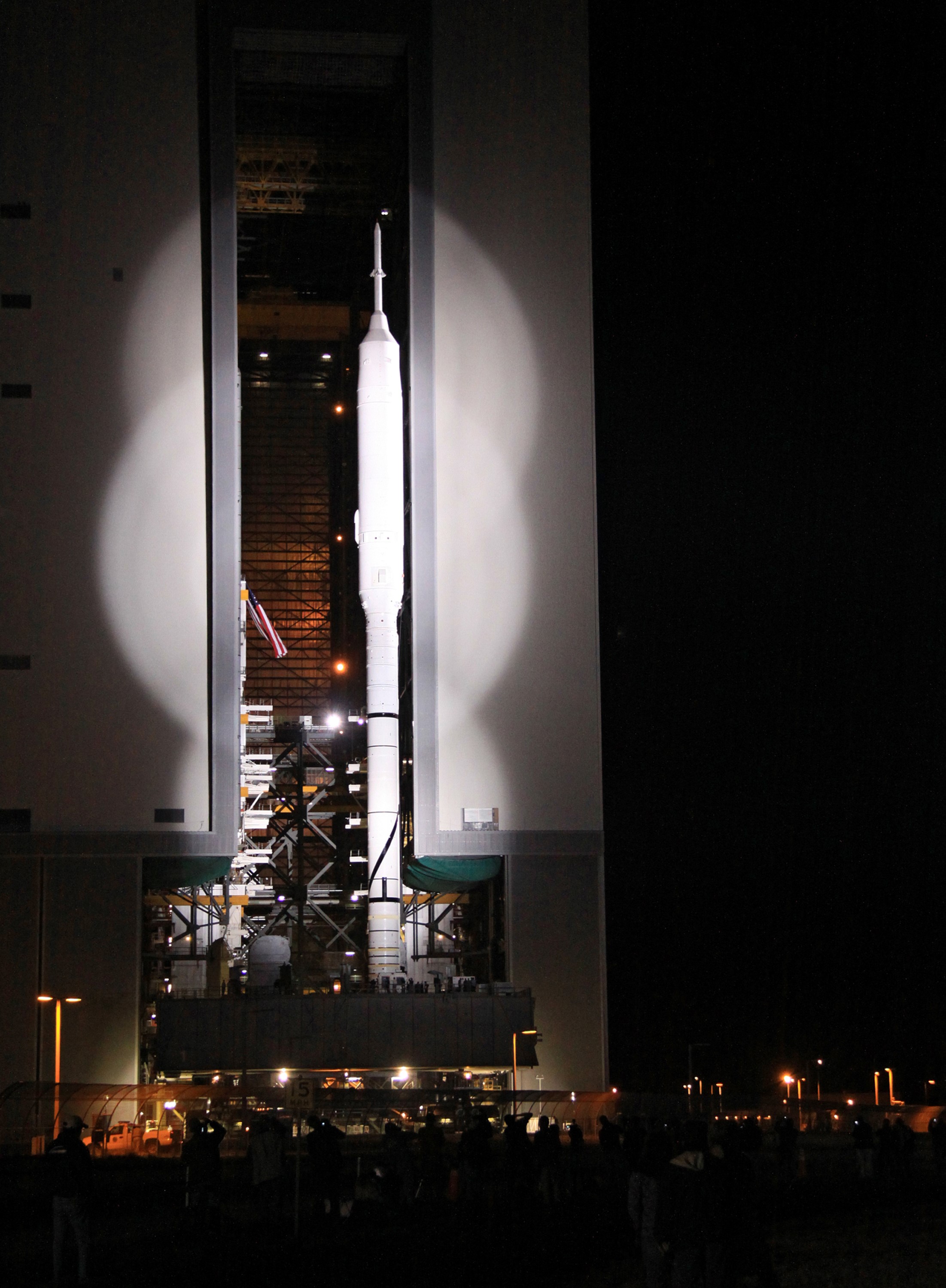 CAPE CANAVERAL, Fla. – Spotlighted in brilliant white, the 327-foot-tall Ares I-X rocket emerges from the Vehicle Assembly Building at NASA's Kennedy Space Center in Florida. The move to the launch pad, known as "rollout," began at 1:39 a.m. EDT. The transfer of the pad from the Space Shuttle Program to the Constellation Program took place May 31. Modifications made to the pad include the removal of shuttle unique subsystems, such as the orbiter access arm and a section of the gaseous oxygen vent arm, along with the installation of three 600-foot lightning towers, access platforms, environmental control systems and a vehicle stabilization system. Part of the Constellation Program, the Ares I-X is the test vehicle for the Ares I. The Ares I-X flight test is targeted for Oct. 27. For information on the Ares I-X vehicle and flight test, visit http://www.nasa.gov/aresIX. Photo credit: NASA/Jack Pfaller