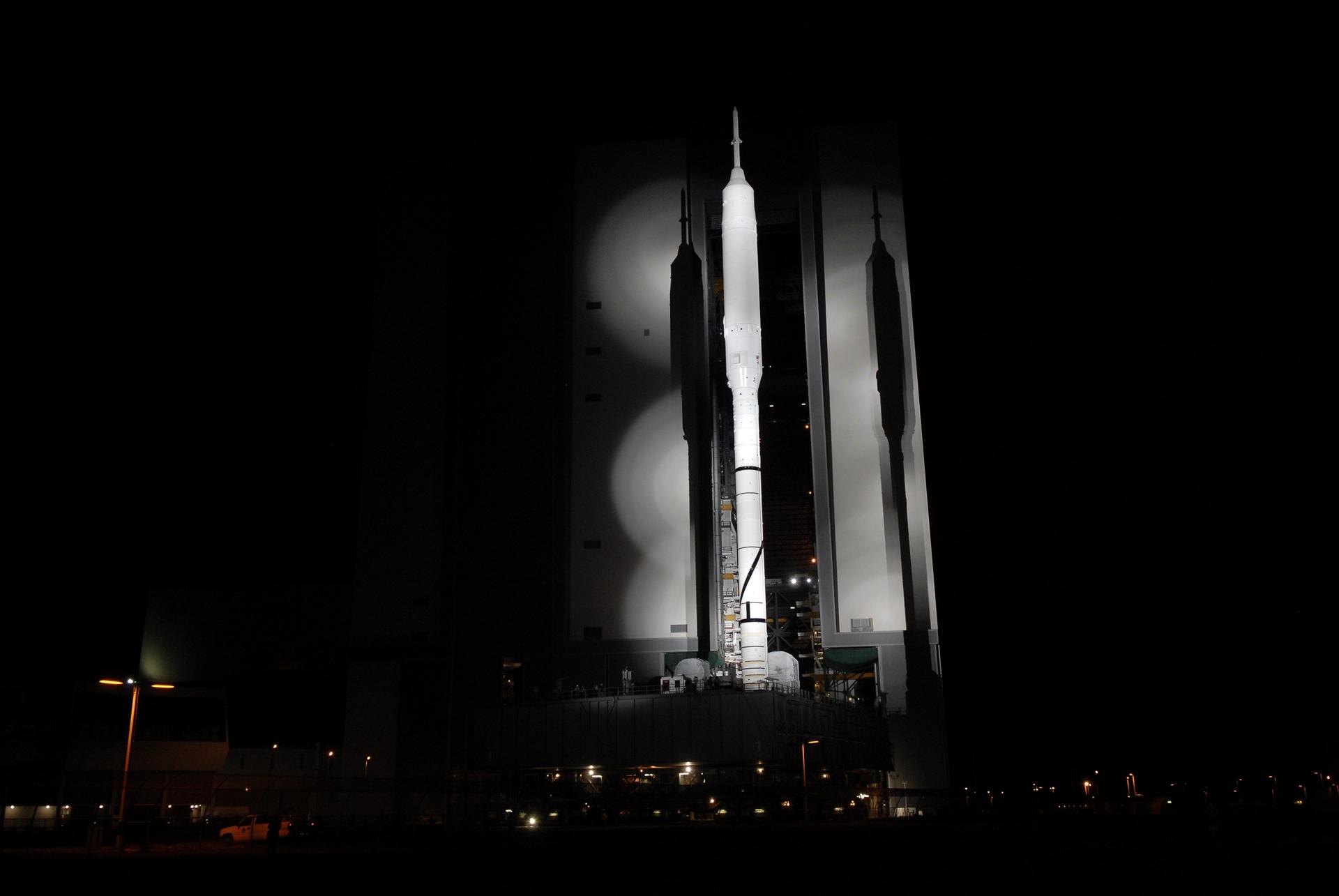 CAPE CANAVERAL, Fla. - The towering 327-foot-tall Ares I-X rocket rides aboard a crawler-transporter as it exits the massive Vehicle Assembly Building at NASA's Kennedy Space Center in Florida. The rocket is bolted to its mobile launcher platform for the move to the launch pad. The transfer of the pad from the Space Shuttle Program to the Constellation Program took place May 31. Modifications made to the pad include the removal of shuttle unique subsystems, such as the orbiter access arm and a section of the gaseous oxygen vent arm, along with the installation of three 600-foot lightning towers, access platforms, environmental control systems and a vehicle stabilization system. Part of the Constellation Program, the Ares I-X is the test vehicle for the Ares I. The Ares I-X flight test is targeted for Oct. 27. For information on the Ares I-X vehicle and flight test, visit http://www.nasa.gov/aresIX. Photo credit: NASA/Kim Shiflett