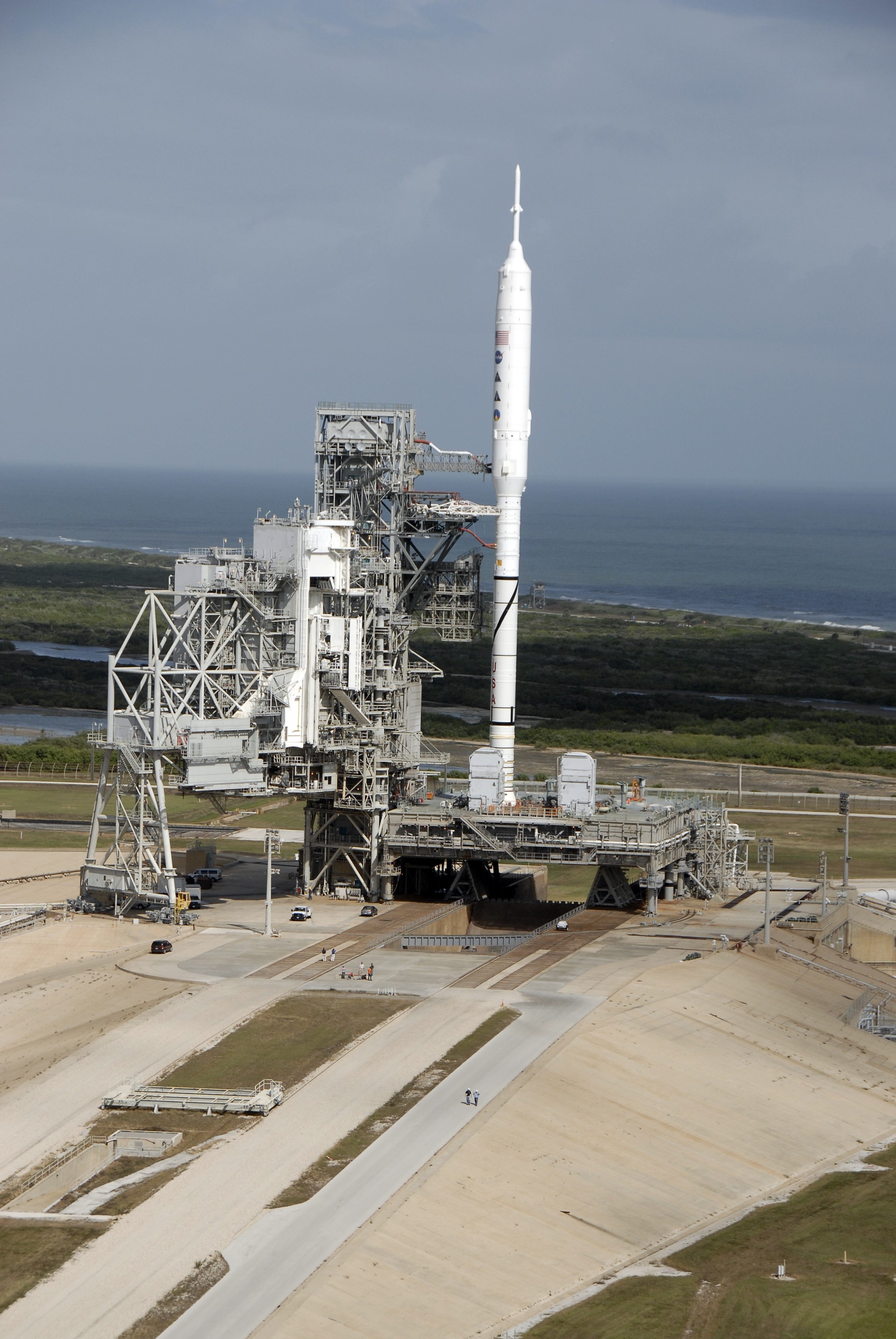 CAPE CANAVERAL, Fla. – At NASA's Kennedy Space Center in Florida, the 327-foot-tall Ares I-X rocket awaits liftoff on Launch Pad 39B on its upcoming flight test. In the background is the Atlantic Ocean. This is the first time since the Apollo Program's Saturn rockets were retired that a vehicle other than the space shuttle has occupied the pad. Modifications to the pad to support the Ares I-X included the removal of shuttle unique subsystems, such as the orbiter access arm and a section of the gaseous oxygen vent arm, and the installation of three 600-foot lightning towers, access platforms, environmental control systems and a vehicle stabilization system. Part of the Constellation Program, the Ares I-X is the test vehicle for the Ares I. The Ares I-X flight test is set for Oct. 27. For information on the Ares I-X vehicle and flight test, visit http://www.nasa.gov/aresIX. Photo credit: NASA/Kim Shiflett