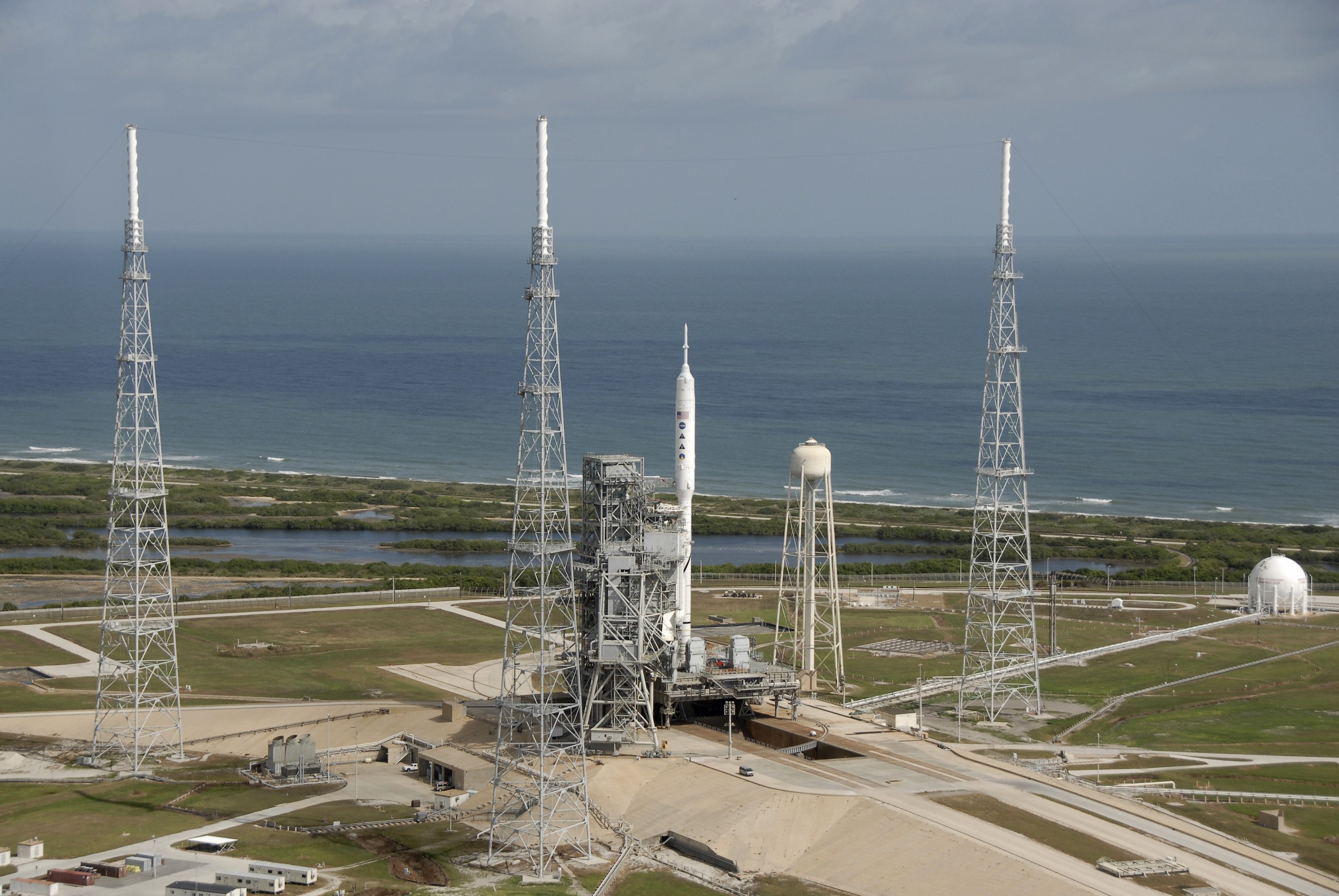 CAPE CANAVERAL, Fla. – The 327-foot-tall Ares I-X rocket is not the tallest structure on Launch Pad 39B beside the Atlantic Ocean at NASA's Kennedy Space Center in Florida. Situated around the pad are three 100-foot fiberglass lightning masts mounted atop 500-foot towers. This is the first time since the Apollo Program's Saturn rockets were retired that a vehicle other than the space shuttle has occupied the pad. The transfer of the pad from the Space Shuttle Program to the Constellation Program took place May 31. Pad modifications to support the Ares I-X include the removal of shuttle unique subsystems, such as the orbiter access arm and a section of the gaseous oxygen vent arm, and the installation of three 600-foot lightning towers, access platforms, environmental control systems and a vehicle stabilization system. Part of the Constellation Program, the Ares I-X is the test vehicle for the Ares I. The Ares I-X flight test is set for Oct. 27. For information on the Ares I-X vehicle and flight test, visit http://www.nasa.gov/aresIX. Photo credit: NASA/Kim Shiflett