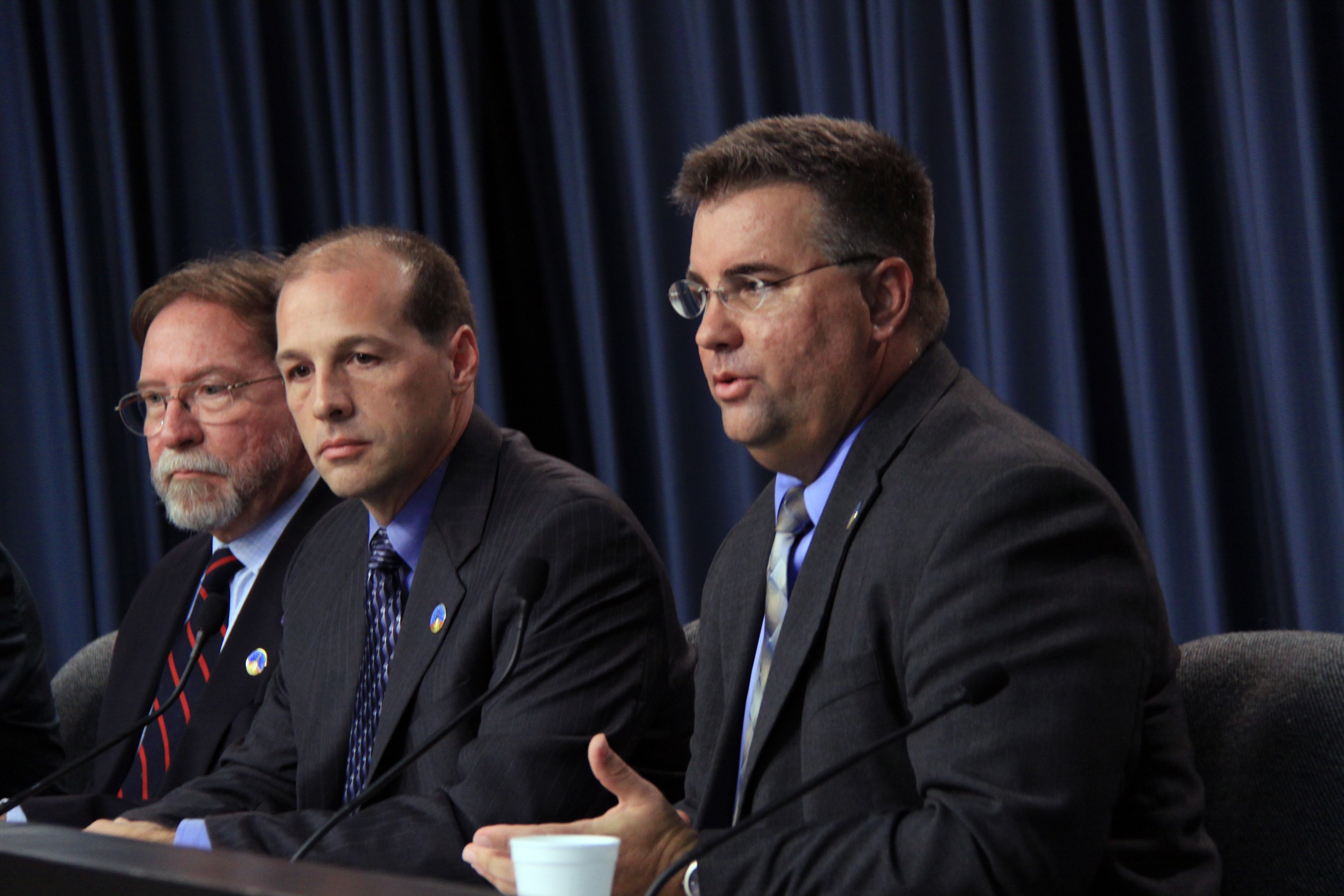 CAPE CANAVERAL, Fla. – At NASA's Kennedy Space Center in Florida, a news conference is held in the Press Site auditorium following the conclusion of the flight test readiness review, or FTRR, for the Ares I-X test rocket. From left are Doug Cooke, associate administrator for NASA's Exploration Systems Mission Directorate; Bob Ess, mission manager for the Ares I-X flight test; and Edward Mango, launch director for the Ares I-X flight test. During the meeting, senior NASA and contractor managers assessed the risks associated with the test and determined the rocket, support systems and procedures are ready for launch. The Ares I-X launch date was announced after the FTRR and is officially set for Oct. 27. For information on the Ares I-X vehicle and flight test, visit http://www.nasa.gov/aresIX. Photo credit: NASA/Jack Pfaller