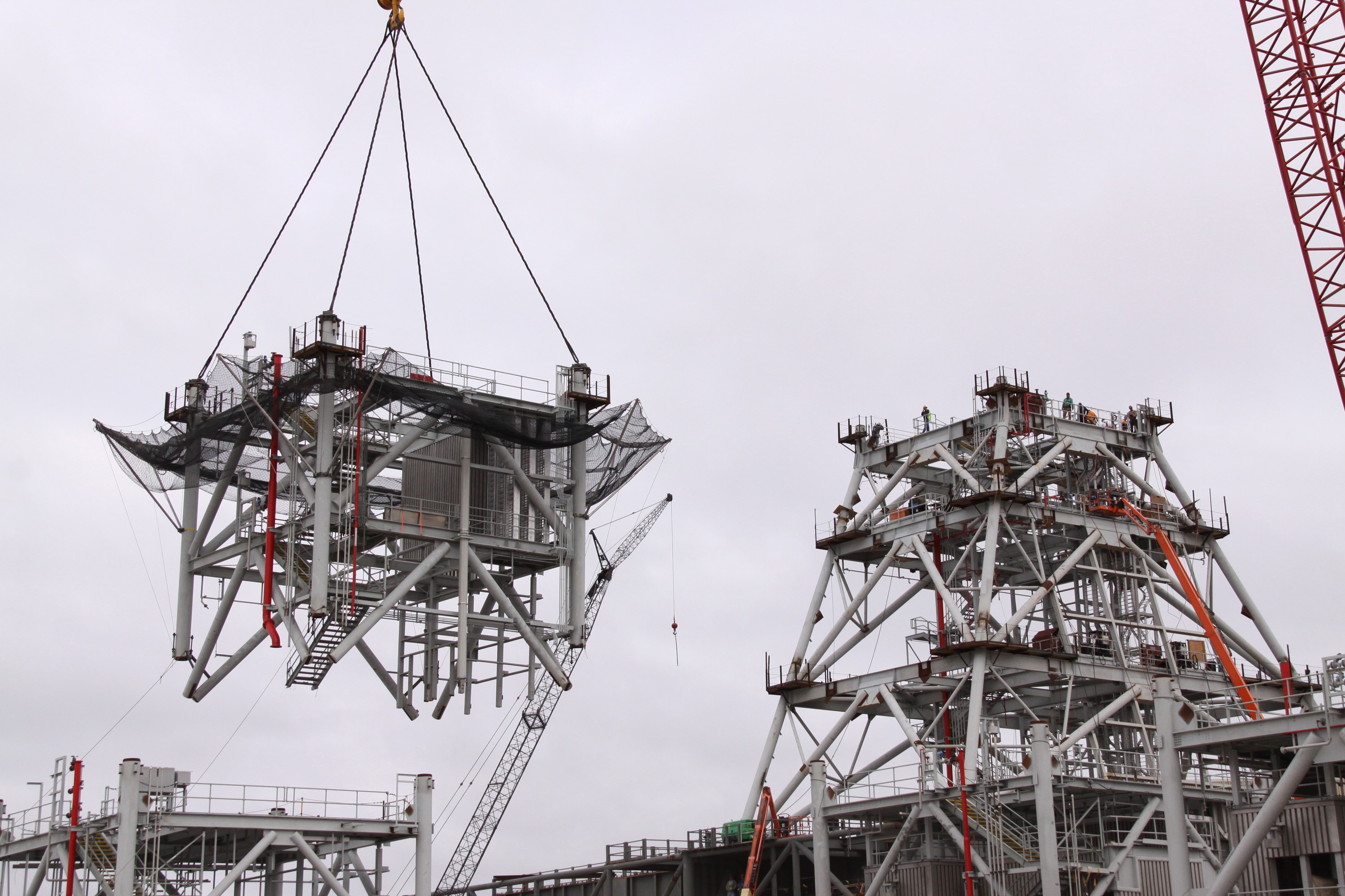 CAPE CANAVERAL, Fla. – At NASA's Kennedy Space Center in Florida, the fourth section of tower is lifted toward three sections already secured to a new mobile launcher, or ML, being constructed to support the Constellation Program. The tower will be approximately 345 feet tall when completed and have multiple platforms for personnel access. The ML is being built at the mobile launcher park site area north of Kennedy's Vehicle Assembly Building. The launcher will provide a base to launch the Ares I, designed to transport the Orion crew exploration vehicle, its crew and cargo to low Earth orbit. The base is being made lighter than space shuttle mobile launcher platforms so the crawler-transporter can pick up the heavier load of the tower and taller rocket. For information on the Ares I, visit http://www.nasa.gov/ares. Photo credit: NASA/Jack Pfaller