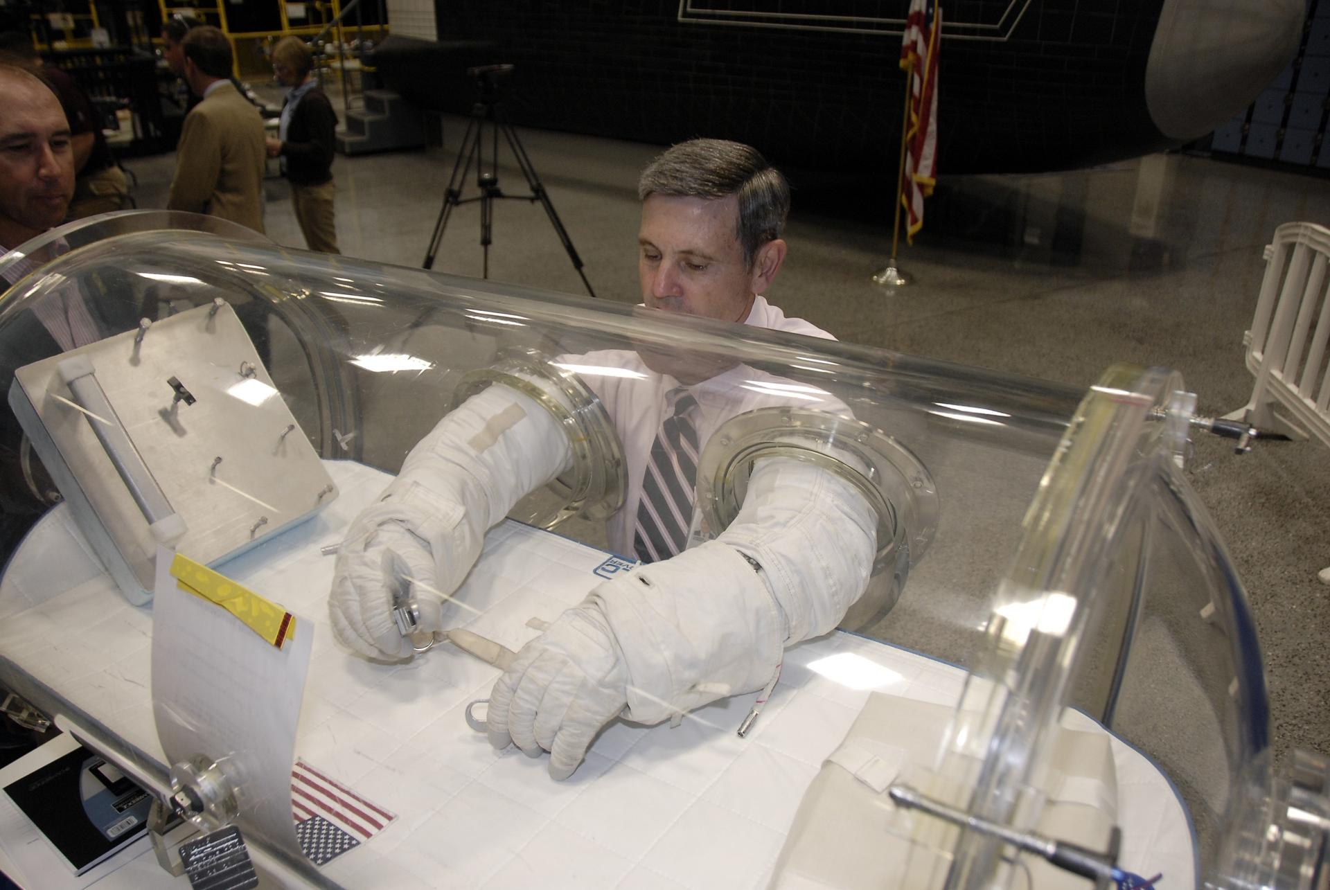 CAPE CANAVERAL, Fla. – At the Astronaut Hall of Fame near NASA’s Kennedy Space Center in Florida, Kennedy Director Bob Cabana, a former astronaut, tries out a pair of space gloves for their dexterity and flexibility in a glove box at the 2009 Astronaut Glove Challenge, part of NASA’s Centennial Challenges Program. The nationwide competition focused on developing improved pressure suit gloves for astronauts to use while working in space. During the challenge, the gloves were submitted to burst tests, joint force tests and tests to measure their dexterity and strength during operation in a glove box which simulates the vacuum of space. Centennial Challenges is NASA’s program of technology prizes for the citizen-inventor. The winning prize for the Glove Challenge is $250,000 provided by the Centennial Challenges Program. Photo credit: NASA/Kim Shiflett