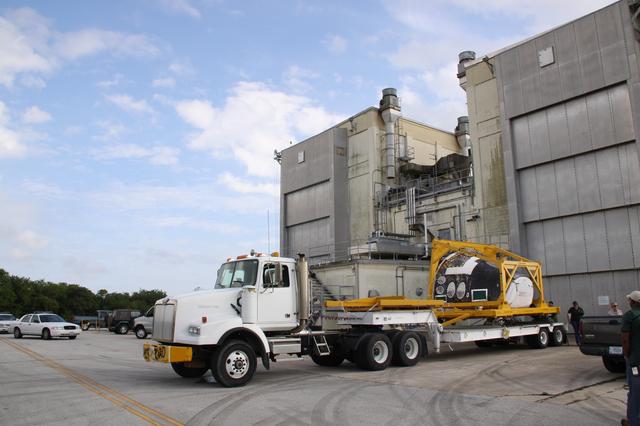 CAPE CANAVERAL, Fla. - At the Hypergolic Maintenance Facility at NASA's Kennedy Space Center in Florida, the Forward Reaction Control System, or FRCS, for space shuttle Discovery is secured on a truck bed and ready for transport to Orbiter Processing Facility Bay 3. Discovery is being prepared for the STS-131 mission, the 33rd flight to the International Space Station. The FRCS provides the thrust for attitude (rotational) maneuvers (pitch, yaw and roll) and for small velocity changes along the orbiter axis (translation maneuvers). The seven-member STS-131 crew will deliver a Multi-Purpose Logistics Module filled with resupply stowage platforms and racks to be transferred to locations around the station. Three spacewalks will include work to attach a spare ammonia tank assembly to the station's exterior and return a European experiment from outside the station's Columbus module. Discovery's launch is targeted for March 18, 2010. For information on the STS-131 mission and crew, visit http://www.nasa.gov/mission_pages/shuttle/shuttlemissions/sts131/index.html. Photo credit: NASA/Troy Cryder