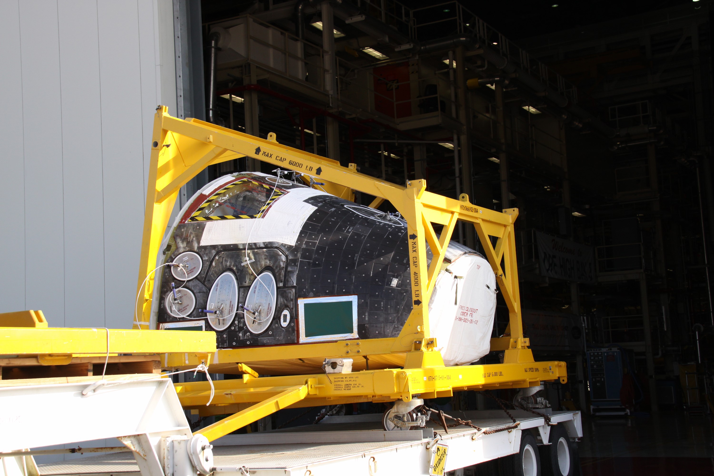 CAPE CANAVERAL, Fla. - At the Hypergolic Maintenance Facility at NASA's Kennedy Space Center in Florida, the Forward Reaction Control System, or FRCS, for space shuttle Discovery is secured on a truck bed and ready for transport to Orbiter Processing Facility Bay 3. Discovery is being prepared for the STS-131 mission, the 33rd flight to the International Space Station. The FRCS provides the thrust for attitude (rotational) maneuvers (pitch, yaw and roll) and for small velocity changes along the orbiter axis (translation maneuvers). The seven-member STS-131 crew will deliver a Multi-Purpose Logistics Module filled with resupply stowage platforms and racks to be transferred to locations around the station. Three spacewalks will include work to attach a spare ammonia tank assembly to the station's exterior and return a European experiment from outside the station's Columbus module. Discovery's launch is targeted for March 18, 2010. For information on the STS-131 mission and crew, visit http://www.nasa.gov/mission_pages/shuttle/shuttlemissions/sts131/index.html. Photo credit: NASA/Troy Cryder