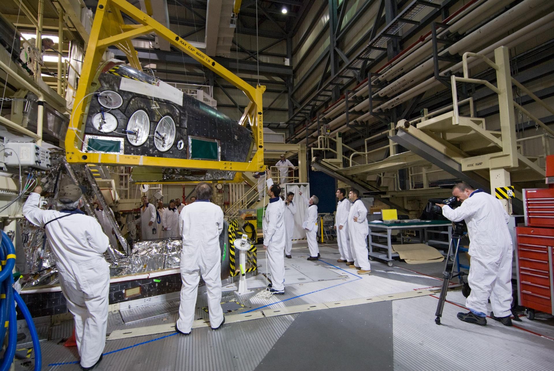 CAPE CANAVERAL, Fla. - In Orbiter Processing Facility Bay 3 at NASA's Kennedy Space Center in Florida, United Space Alliance technicians lower space shuttle Discovery's Forward Reaction Control System, or FRCS, into position over the shuttle's frame. The FRCS is being reinstalled in the forward fuselage nose area of the shuttle after refurbishment. The FRCS provides the thrust for attitude (rotational) maneuvers (pitch, yaw and roll) and for small velocity changes along the orbiter axis (translation maneuvers). Discovery is being prepared for the STS-131 mission, the 33rd flight to the International Space Station. The seven-member STS-131 crew will deliver a Multi-Purpose Logistics Module filled with resupply stowage platforms and racks to be transferred to locations around the station. Three spacewalks will include work to attach a spare ammonia tank assembly to the station's exterior and return a European experiment from outside the station's Columbus module. Discovery's launch is targeted for March 18, 2010. For information on the STS-131 mission and crew, visit http://www.nasa.gov/mission_pages/shuttle/shuttlemissions/sts131/index.html. Photo credit: NASA/Amanda Diller