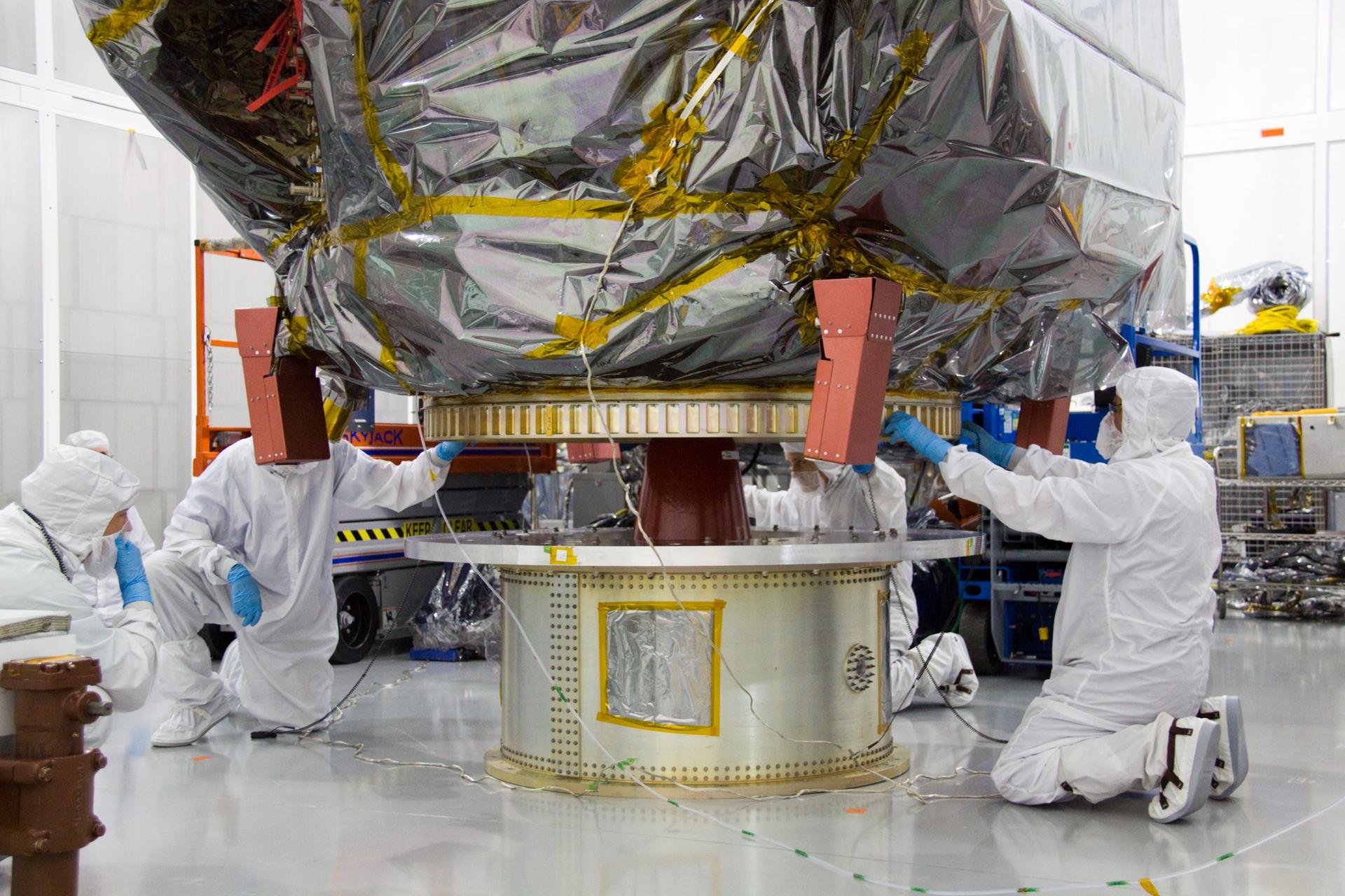 CAPE CANAVERAL, Fla. – At the Astrotech Space Operations facility in Titusville, Fla., technicians from NASA's Goddard Space Flight Center prepare to lift the bagged Solar Dynamics Observatory, or SDO, onto a dolly for further processing. SDO is the first space weather research network mission in NASA's Living With a Star Program. The spacecraft's long-term measurements will give solar scientists in-depth information about changes in the sun's magnetic field and insight into how they affect Earth. Liftoff on an Atlas V rocket is scheduled for Feb. 3, 2010. For information on SDO, visit http://www.nasa.gov/sdo. Photo credit: NASA/Troy Cryder