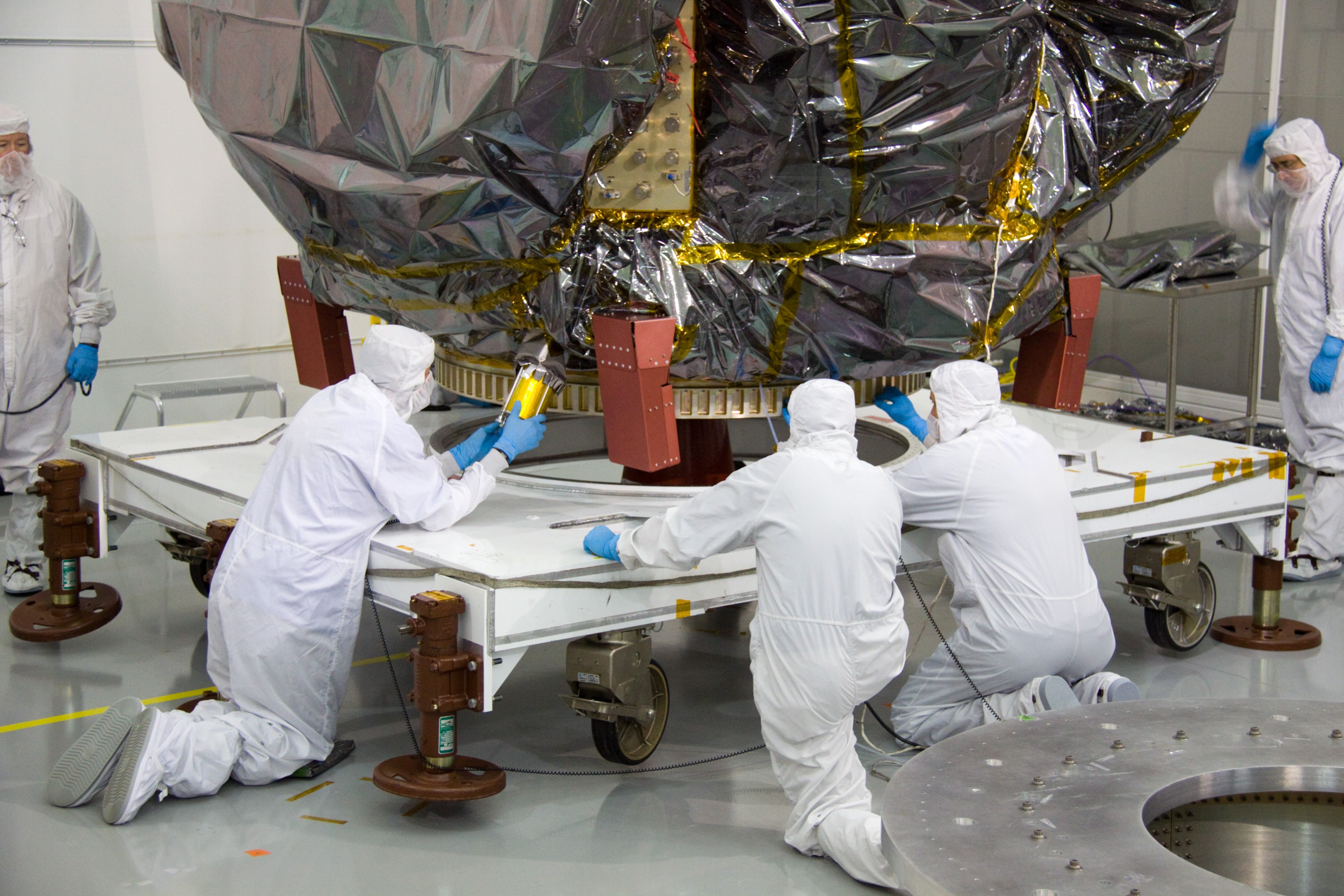 CAPE CANAVERAL, Fla. – At the Astrotech Space Operations facility in Titusville, Fla., NASA Goddard Space Flight Center technician Carl Clause, second from left, installs an aft omni coupler on the bagged Solar Dynamics Observatory, or SDO. SDO is the first space weather research network mission in NASA's Living With a Star Program. The spacecraft's long-term measurements will give solar scientists in-depth information about changes in the sun's magnetic field and insight into how they affect Earth. Liftoff on an Atlas V rocket is scheduled for Feb. 3, 2010. For information on SDO, visit http://www.nasa.gov/sdo. Photo credit: NASA/Troy Cryder
