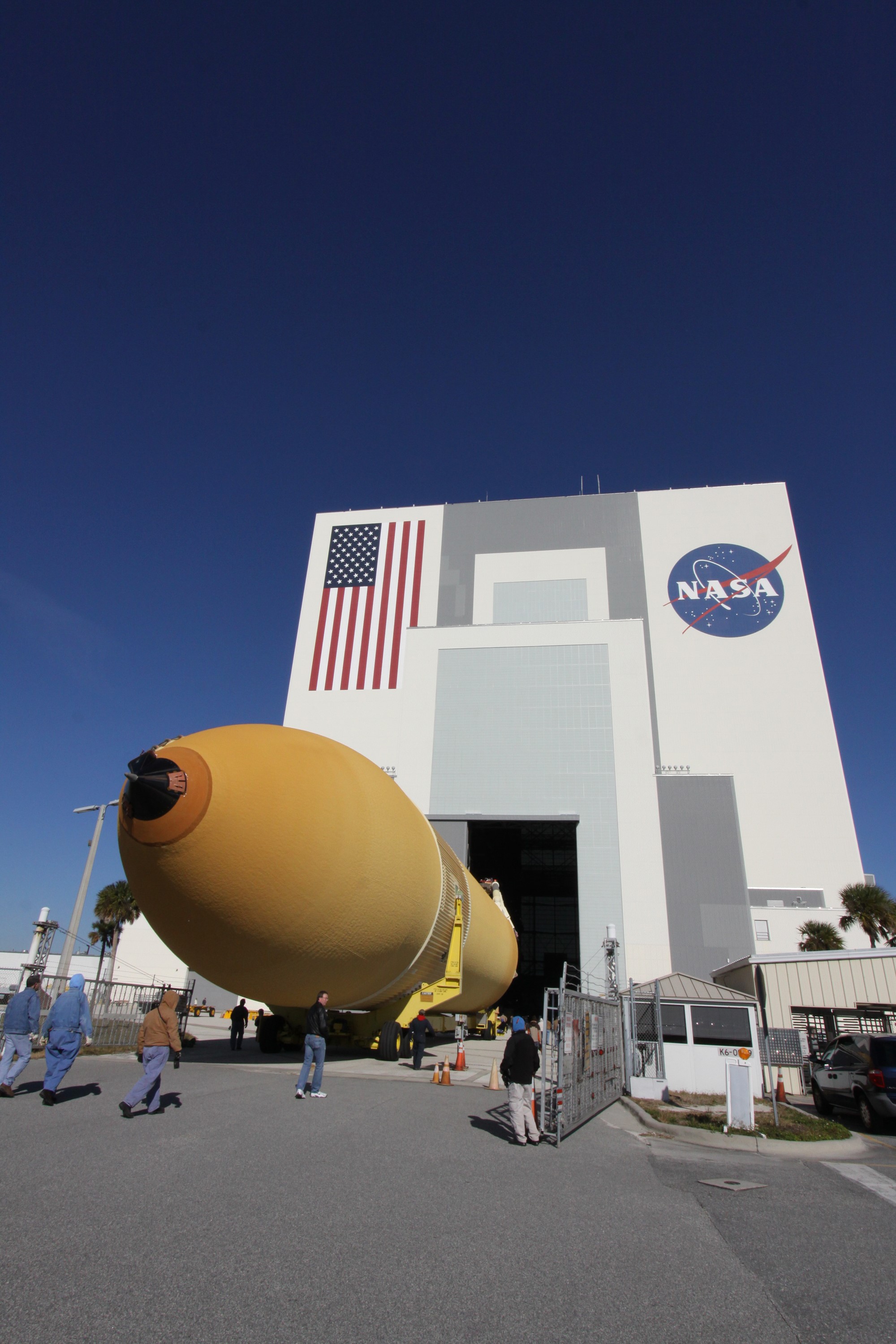 CAPE CANAVERAL, Fla. – At NASA's Kennedy Space Center in Florida, External Tank-135 approaches the Vehicle Assembly Building, door gaping wide in the background. The tank arrived in Florida on Dec. 26 aboard the Pegasus barge, towed by a solid rocket booster retrieval ship from NASA's Michoud Assembly Facility near New Orleans. ET-135 will be used to launch space shuttle Discovery on the STS-131 mission to the International Space Station. Launch is targeted for March 18. For information on the components of the space shuttle and the STS-131 mission, visit http://www.nasa.gov/mission_pages/shuttle/shuttlemissions/sts131/index.html. Photo credit: NASA/Jack Pfaller