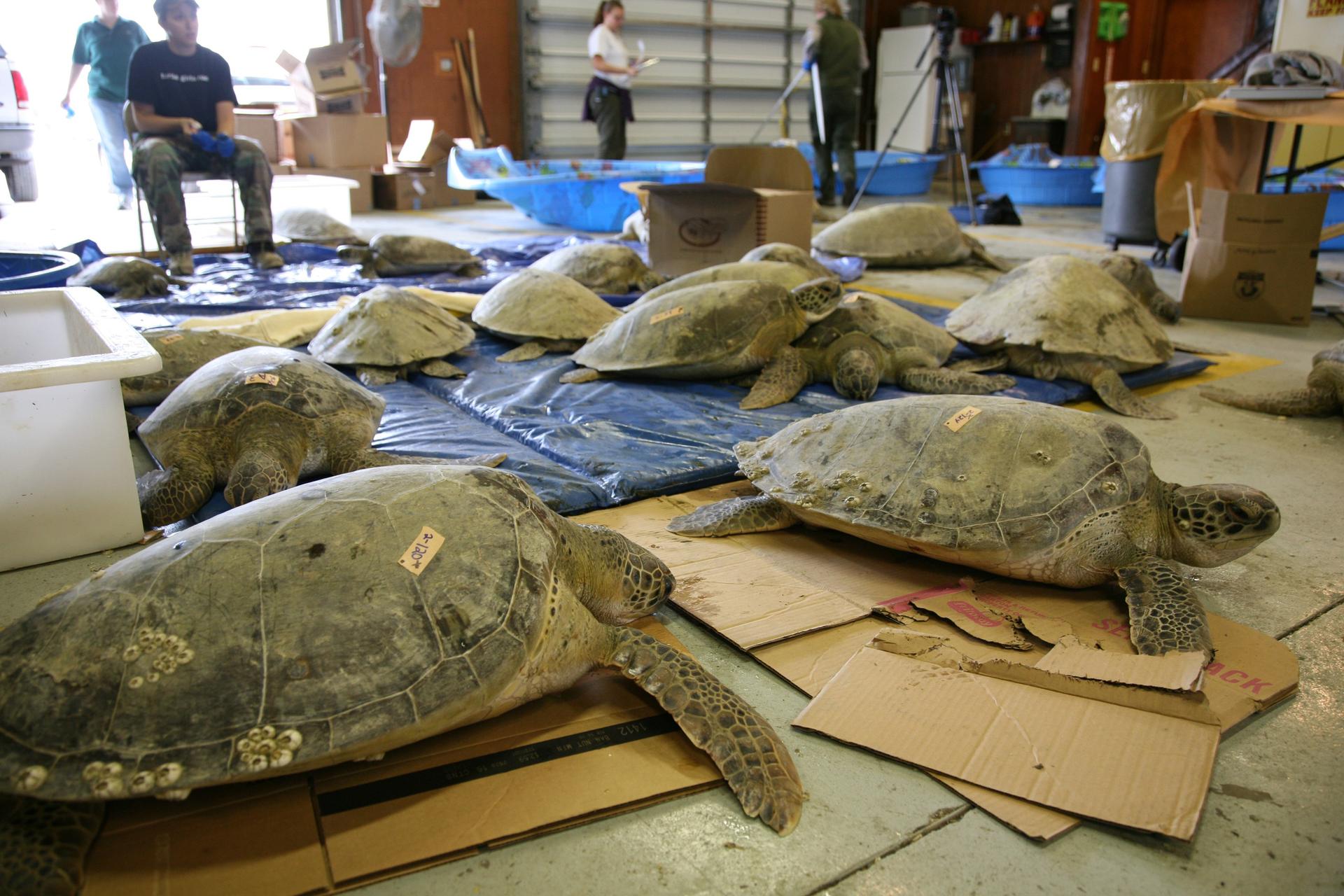 CAPE CANAVERAL, Fla. – A few of the green sea turtles are seen inside the headquarters building of the Merritt Island Wildlife Refuge located on NASA's Kennedy Space Center in Florida. The turtles were some of many "stunned" by the recent drop in temperatures in Florida. Many of the turtles were rescued from the Mosquito Lagoon, with others coming from the Indian River Lagoon and Cocoa Beach. Photo credit: NASA/Amanda Diller