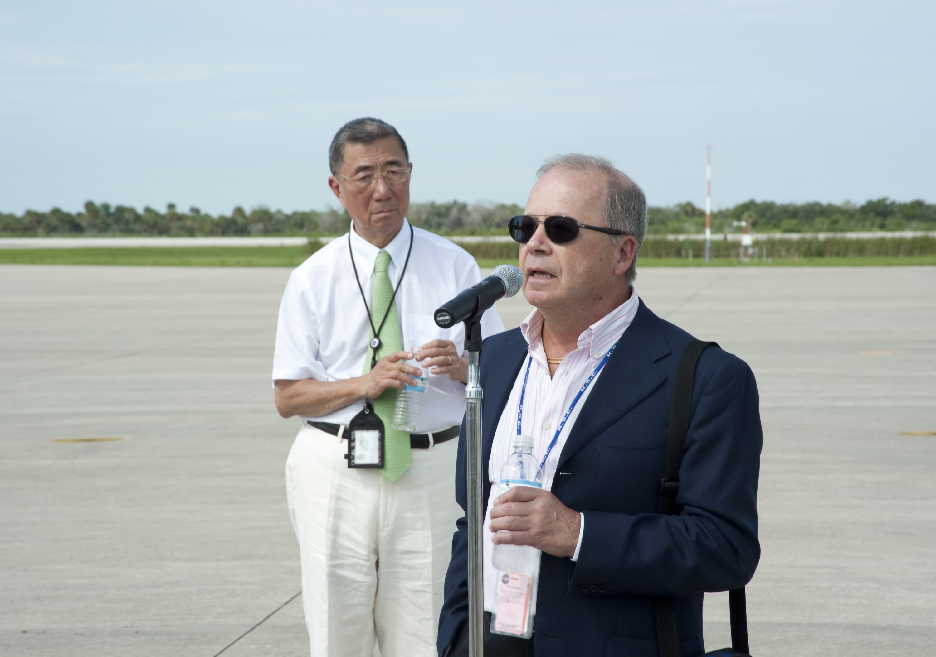 CAPE CANAVERAL, Fla. -- At the Shuttle Landing Facility at NASA's Kennedy Space Center in Florida, Professor Sam Ting, AMS Principal Investigator from the Massachusetts Institute of Technology listens intently as Professor Manuel Aguilar, AMS Spanish Coordinator, speaks to the media before the arrival of the Alpha Magnetic Spectrometer, or AMS. AMS, a state-of-the-art particle physics detector, is designed to operate as an external module on the International Space Station. It will use the unique environment of space to study the universe and its origin by searching for dark matter. The STS-134 crew will fly AMS to the International Space Station aboard space shuttle Endeavour, targeted to launch Feb. 26, 2011. Photo credit: NASA/Kim Shiflett