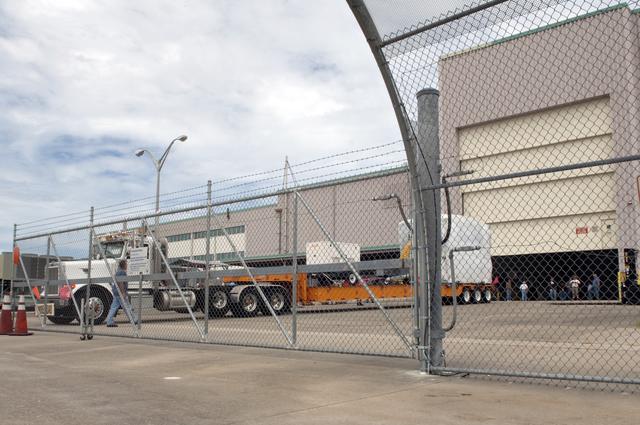 CAPE CANAVERAL, Fla. -- At NASA's Kennedy Space Center in Florida, a tractor-trailer carrying the Alpha Magnetic Spectrometer, or AMS, at the Space Station Processing Facility, where it will be processed for launch. AMS arrived on Kennedy's Shuttle Landing Facility aboard an Air Force C-5M aircraft from Europe. AMS, a state-of-the-art particle physics detector, is designed to operate as an external module on the International Space Station. It will use the unique environment of space to study the universe and its origin by searching for dark matter. The STS-134 crew will fly AMS to the International Space Station aboard space shuttle Endeavour, targeted to launch Feb. 26, 2011. Photo credit: NASA/Frankie Martin
