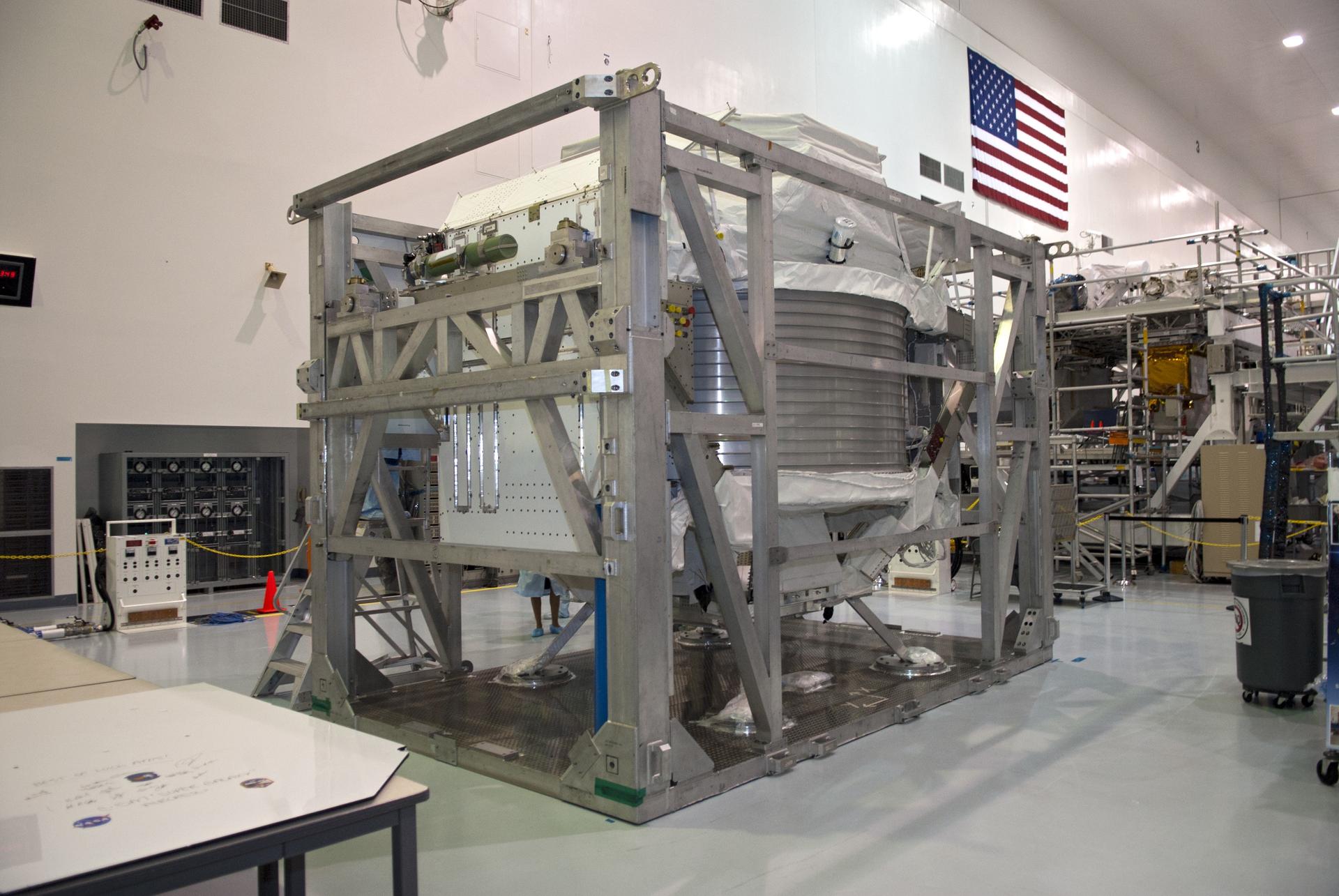 CAPE CANAVERAL, Fla. -- In the Space Station Processing Facility at NASA's Kennedy Space Center in Florida, the protective panels that covered the Alpha Magnetic Spectrometer, or AMS, have been removed so that the technicians can begin preparing it for launch. AMS, a state-of-the-art particle physics detector, is designed to operate as an external module on the International Space Station. It will use the unique environment of space to study the universe and its origin by searching for dark matter. The STS-134 crew will fly AMS to the International Space Station aboard space shuttle Endeavour, targeted to launch Feb. 26, 2011. Photo credit: NASA/Frankie Martin