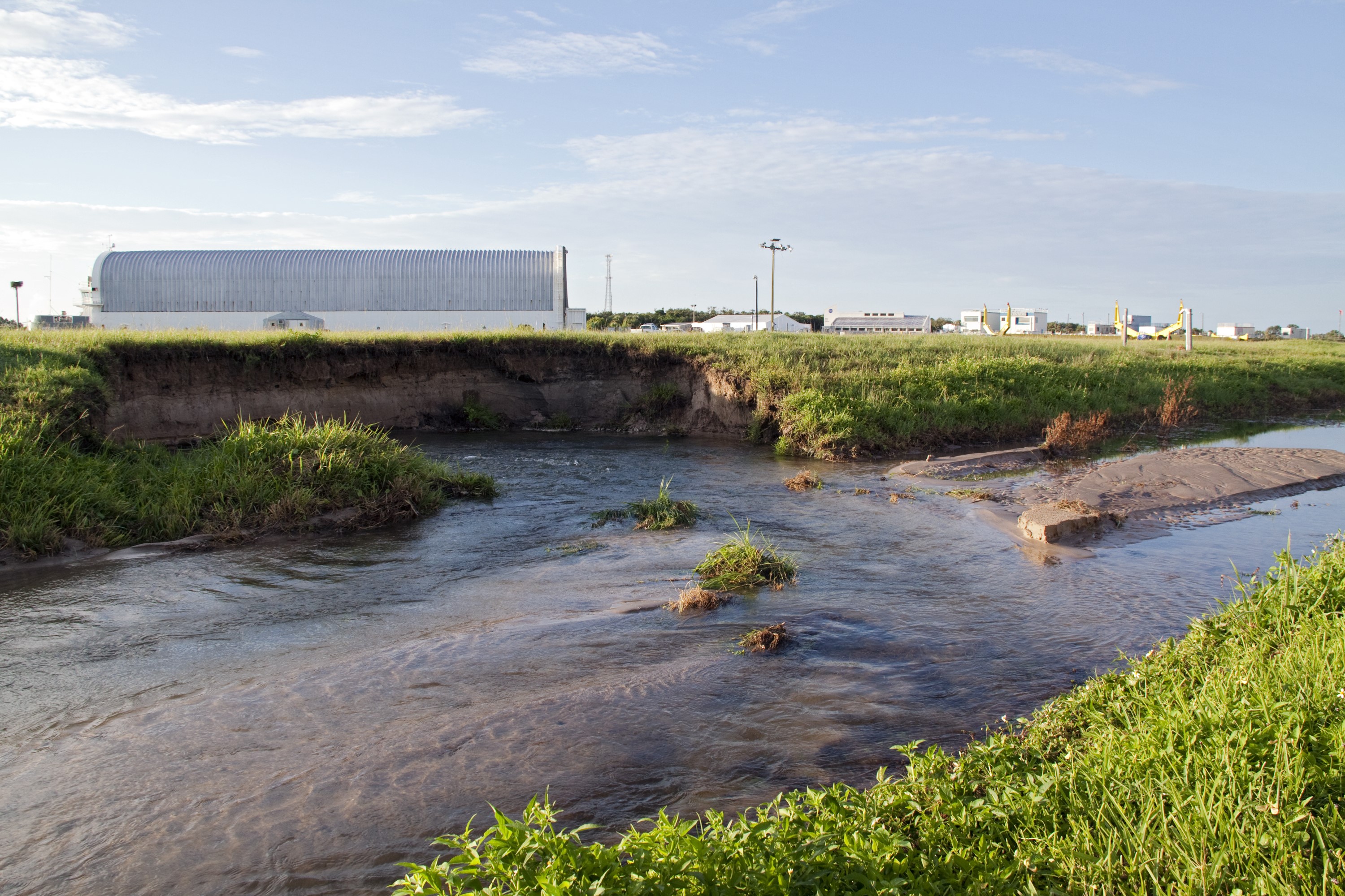 CAPE CANAVERAL, Fla. -- In the LC-39 Complex Turn Basin area across from the Vehicle Assembly Building at NASA's Kennedy Space Center in Florida, a major water main leak in a 24-inch pipe caused soil to wash away near the Press Site. The center was closed for the morning while workers assessed and repaired the break. In the background is the Pegasus barge docked at the Turn Basin which is used to deliver the space shuttle external fuel tank. Photo credit: NASA/Jack Pfaller