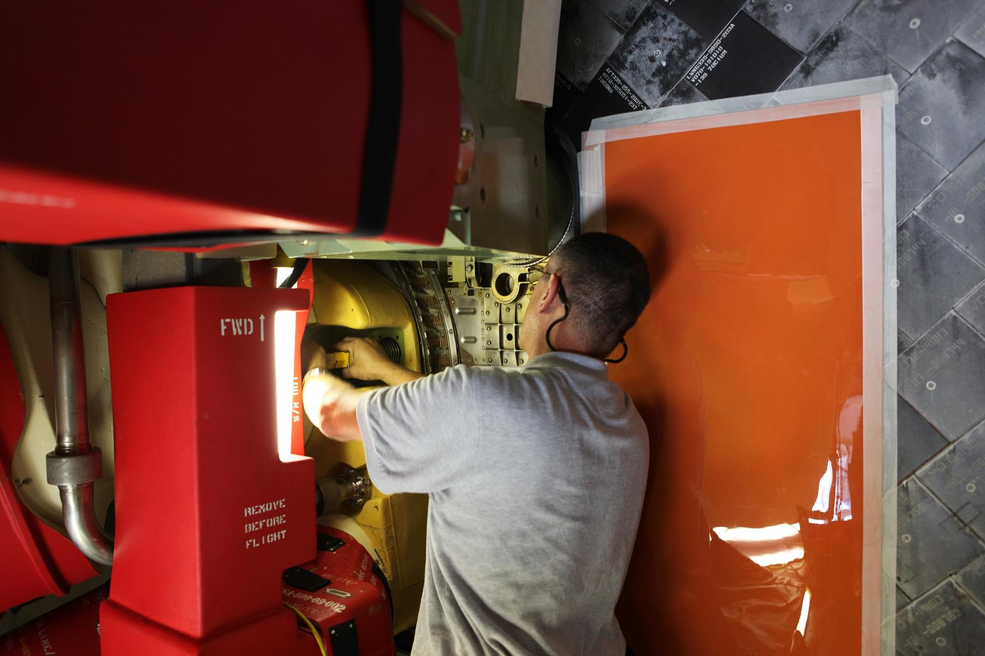 CAPE CANAVERAL, Fla. -- At NASA's Kennedy Space Center in Florida, a Vehicle Assembly Building technician adjusts a left-side main separation bolt that attaches the bottom of space shuttle Discovery to its external fuel tank. As technicians were attaching the bolt Sept. 10, a bolt nut slipped back into Discovery's aft compartment. To retrieve it, technicians entered Discovery’s aft section through an access door. They then moved the nut back into position to finish attaching the bolt, which is used to separate Discovery from the external tank once the shuttle is in orbit. Discovery is scheduled to roll out to Launch Pad 39A later this month for its STS-133 launch to the International Space Station. Targeted to lift off Nov. 1, Discovery will take the Permanent Multipurpose Module (PMM) packed with supplies and critical spare parts, as well as Robonaut 2 (R2) to the station. Photo credit: NASA/Dimitri Gerondidakis