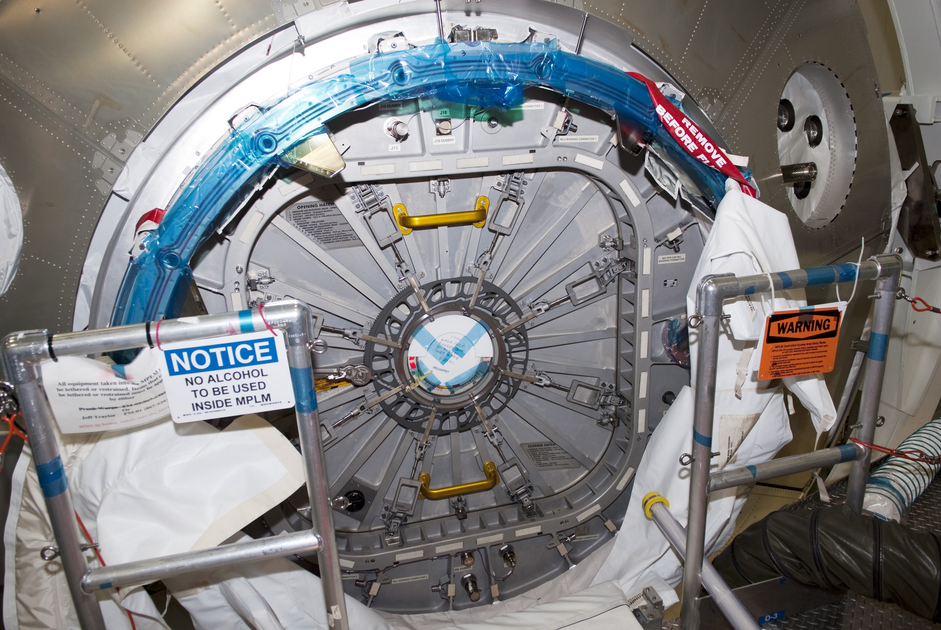CAPE CANAVERAL, Fla. -- Inside the Space Station Processing Facility at NASA's Kennedy Space Center in Florida, the hatch of the Permanent Multipurpose Module (PMM) is closed in preparation for space shuttle Discovery's STS-133 mission to the International Space Station. Robonaut 2 (R2) and critical spare parts are packed inside the PMM, which will be left aboard the station on Discovery's final mission. Targeted to launch Nov. 1 at 4:40 p.m. EDT, Discovery and its crew also will carry Express Logistics Carrier-4 (ELC-4), which is filled with external payloads and experiments. For more information visit, www.nasa.gov/shuttle. Photo credit: NASA/Jim Grossmann