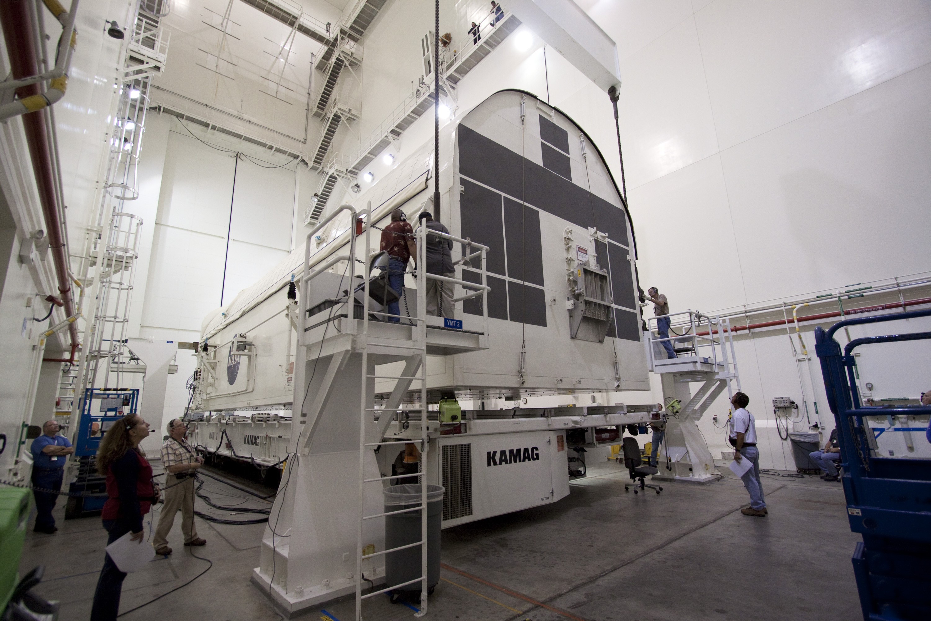 CAPE CANAVERAL, Fla. -- In the Canister Rotation Facility at NASA's Kennedy Space Center in Florida, workers connect an overhead crane to the payload canister for its rotation into a vertical position. The canister will then be delivered to Launch Pad 39A, lifted into the rotating service structure where the module will be moved into the clean room before it is installed into space shuttle Discovery's payload bay. Discovery and its STS-133 crew will deliver the PMM, packed with supplies and critical spare parts, as well as Robonaut 2, the dexterous humanoid astronaut helper, to the International Space Station. Launch is targeted for 4:40 p.m. EDT, Nov. 1. Photo credit: NASA/Jack Pfaller