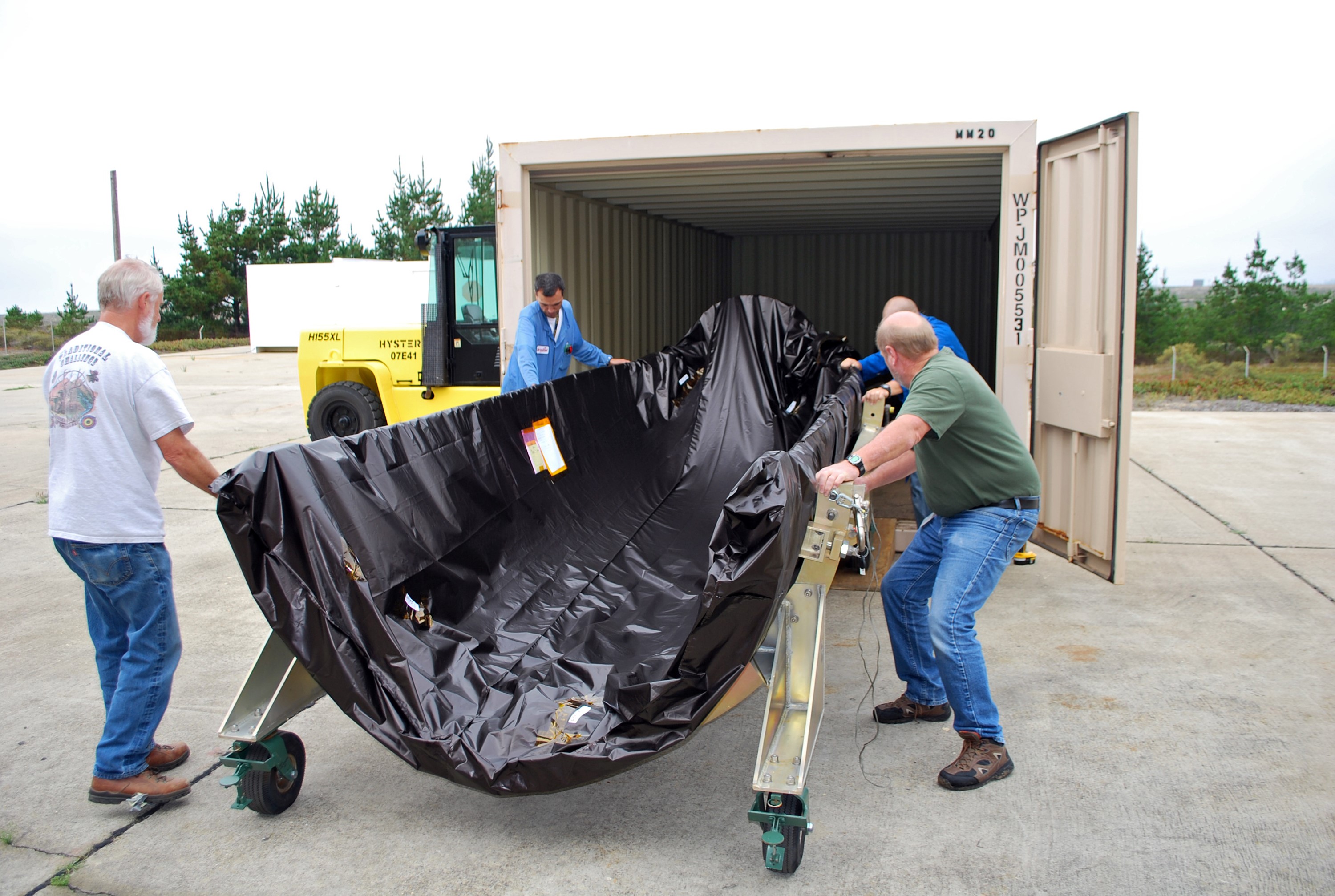 VANDENBERG AIR FORCE BASE, Calif. – At Vandenberg Air Force Base in California, the second half of the fairing that will encapsulate NASA's Glory satellite during launch aboard a Taurus XL rocket is offloaded and moved toward Building 1555. There, the black protective covering will be removed so that the fairing half can be thoroughly cleaned before it is installed around the spacecraft. The four-stage rocket and satellite are being prepared for a launch to low Earth orbit from Vandenberg's Space Launch Complex 576-E. Once Glory reaches orbit, it will collect data on the properties of aerosols and black carbon. It also will help scientists understand how the sun's irradiance affects Earth's climate. Photo credit: NASA/Randy Beaudoin, VAFB
