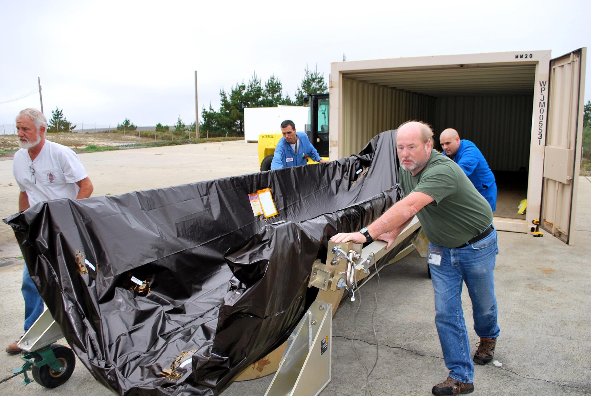 VANDENBERG AIR FORCE BASE, Calif. – At Vandenberg Air Force Base in California, the second half of the fairing that will encapsulate NASA's Glory satellite during launch aboard a Taurus XL rocket is offloaded and moved toward Building 1555. There, the black protective covering will be removed so that the fairing half can be thoroughly cleaned before it is installed around the spacecraft. The four-stage rocket and satellite are being prepared for a launch to low Earth orbit from Vandenberg's Space Launch Complex 576-E. Once Glory reaches orbit, it will collect data on the properties of aerosols and black carbon. It also will help scientists understand how the sun's irradiance affects Earth's climate. Photo credit: NASA/Randy Beaudoin, VAFB