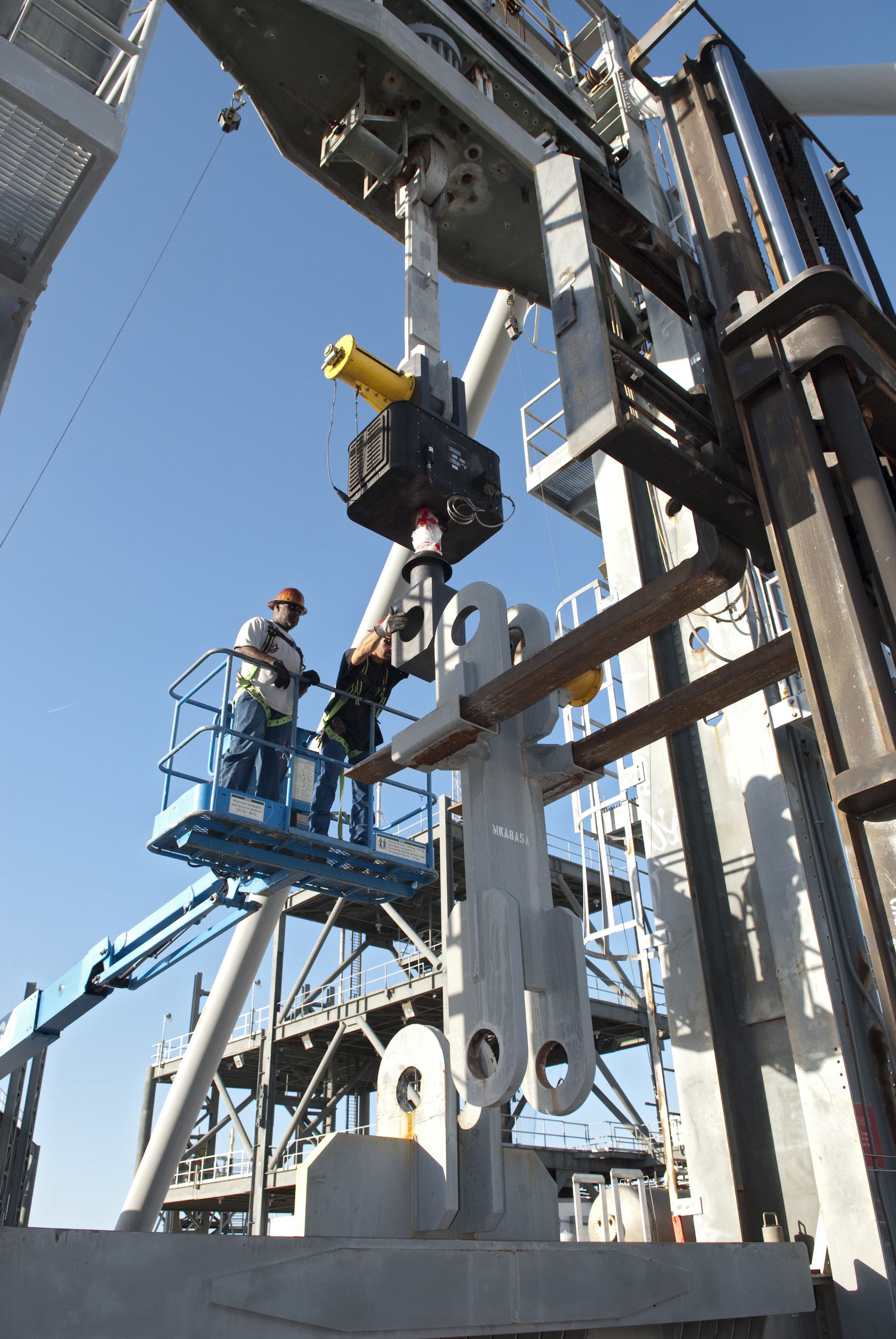 CAPE CANAVERAL, Fla. -- At NASA's Kennedy Space Center in Florida, the 600-Ton Test Fixture outside the Launch Equipment Test Facility conducts a 500,000-pound pull test of a bridge crane lifting element, which is used to lift space shuttles in the Vehicle Assembly Building. The fixture proofload tests, in tension and compression, a variety of ground support equipment, including slings, lifting beams and other critical lifting hardware that require periodic proofloading. Since 1977, the facility has supported NASA’s Launch Services, shuttle, International Space Station, and Constellation programs, as well as commercial providers. The facility recently underwent a major upgrade to support even more programs, projects and customers. It houses a 6,000-square-foot high bay, cable fabrication and molding shop, pneumatics shop, machine and weld shop and full-scale control room. Outside, the facility features a water flow test loop, vehicle motion simulator, launch simulation towers and a cryogenic system. Photo credit: NASA/Jim Grossmann