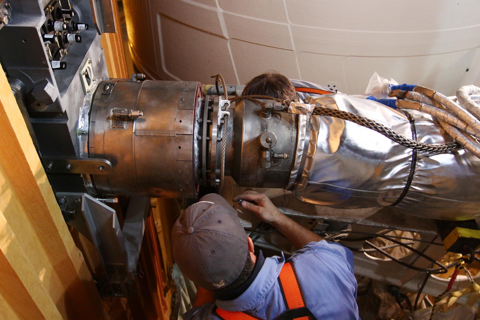 CAPE CANAVERAL, Fla. -- On Launch Pad 39A at NASA's Kennedy Space Center in Florida, technicians reattach the vent line to the ground umbilical carrier plate (GUCP) on space shuttle Discovery's external fuel tank. A hydrogen gas leak at that location during tanking for Discovery's STS-133 mission to the International Space Station caused the launch attempt to be scrubbed Nov. 5. The GUCP is the overboard vent to the pad and the flame stack where the excess hydrogen is burned off. Discovery's next launch attempt is no earlier than Nov. 30 at 4:02 a.m. EST. For more information on STS-133, visit www.nasa.gov/mission_pages/shuttle/shuttlemissions/sts133/. Photo credit: NASA/Ben Smegelsky
