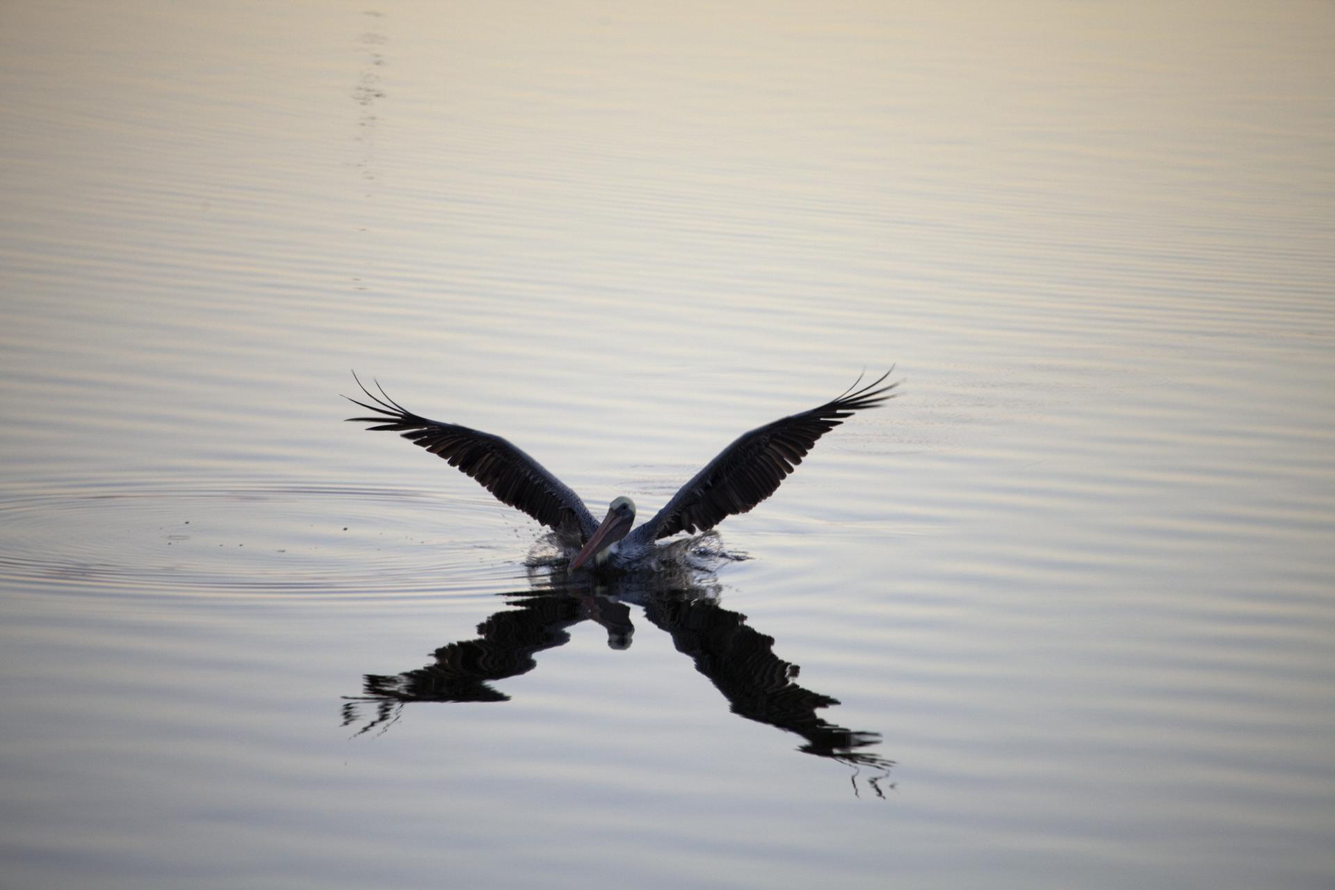 CAPE CANAVERAL, Fla. -- A brown pelican searches for fish in brackish water at NASA's Kennedy Space Center in Florida around dawn. Kennedy coexists with the Merritt Island National Wildlife Refuge, habitat to more than 310 species of birds, 25 mammals, 117 fish and 65 amphibians and reptiles. Photo credit: NASA/Frank Michaux