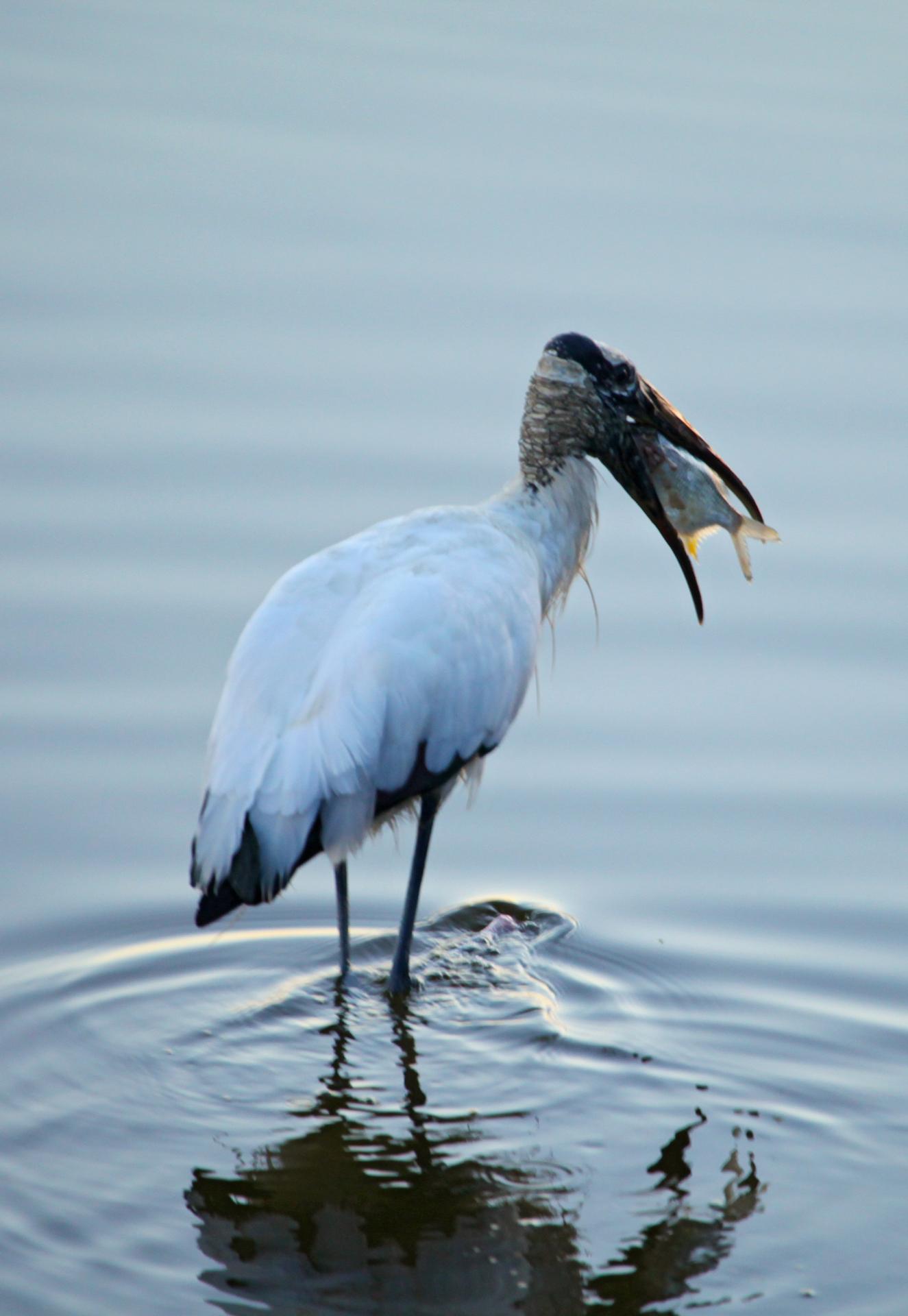 CAPE CANAVERAL, Fla. -- A wood stork eats breakfast while wading in brackish water at NASA's Kennedy Space Center in Florida around dawn. In 1984, the U.S. Fish and Wildlife Service declared the wood stork an endangered species. Kennedy coexists with the Merritt Island National Wildlife Refuge, habitat to more than 310 species of birds, 25 mammals, 117 fish and 65 amphibians and reptiles. Photo credit: NASA/Frank Michaux