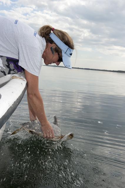CAPE CANAVERAL, Fla. -- Karen Holloway, a biologist with Innovative Health Applications at NASA's Kennedy Space Center in Florida, releases an endangered green sea turtle into the Mosquito Lagoon, which is part of Florida's Indian River. The turtle was one of more than 300 that were "stunned" during two cold snaps in December 2010. Turtles that were stunned multiple times will be released in the Sebastian area of the Indian River, which often offers warmer water and could help prevent future stuns as winter progresses. NASA/Kim Shiflett