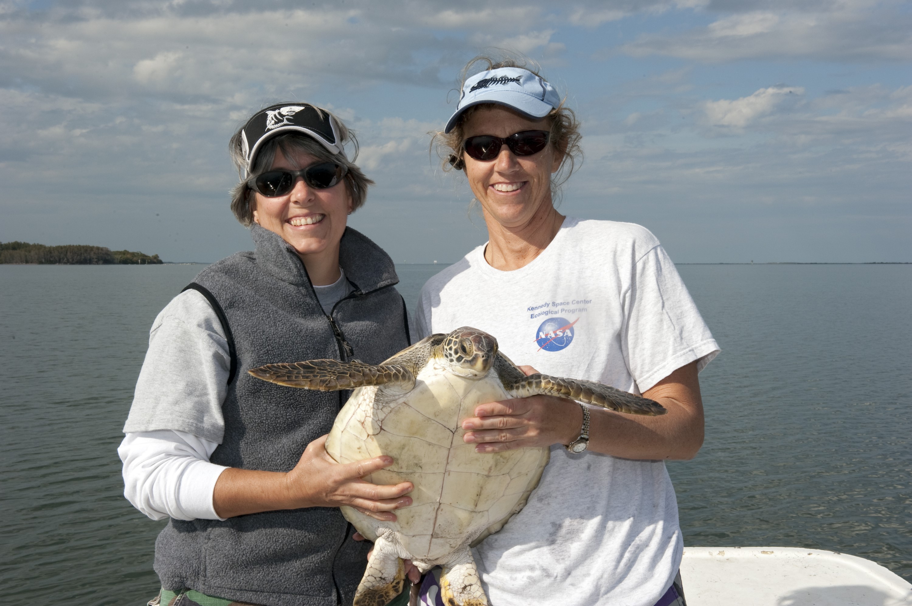 CAPE CANAVERAL, Fla. -- Donna Oddy, left, and Karen Holloway, biologists with Innovative Health Applications at NASA's Kennedy Space Center in Florida, are ready to release an endangered green sea turtle into the Mosquito Lagoon, which is part of Florida's Indian River. The turtle was one of more than 300 that were "stunned" during two cold snaps in December 2010. Turtles that were stunned multiple times will be released in the Sebastian area of the Indian River, which often offers warmer water and could help prevent future stuns as winter progresses. NASA/Kim Shiflett