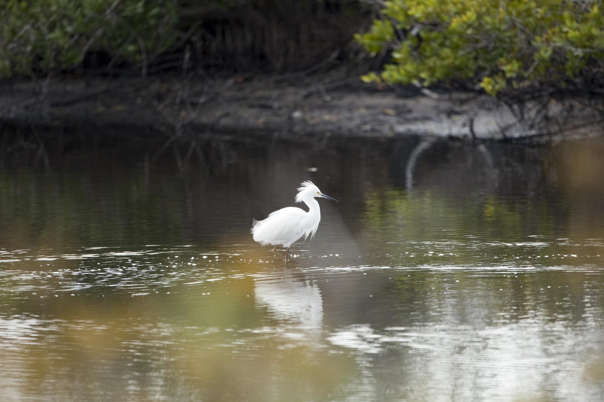 CAPE CANAVERAL, Fla. -- A snowy egret wades through brackish water just north of the Shuttle Landing Facility at NASA's Kennedy Space Center in Florida. This type of bird often stalks its prey in shallow water by running or shuffling its feet, flushing small fish, shrimp, frogs or crabs into view. Kennedy coexists with the Merritt Island National Wildlife Refuge, habitat to more than 310 species of birds, 25 mammals, 117 fish and 65 amphibians and reptiles. Photo credit: NASA/Frankie Martin