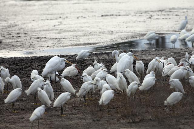 CAPE CANAVERAL, Fla. -- Great white and snowy white egrets gather just north of the Shuttle Landing Facility at NASA's Kennedy Space Center in Florida. Kennedy coexists with the Merritt Island National Wildlife Refuge, habitat to more than 310 species of birds, 25 mammals, 117 fish and 65 amphibians and reptiles. Photo credit: NASA/Frankie Martin