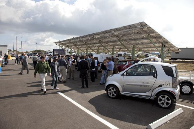 CAPE CANAVERAL, Fla. -- NASA's Kennedy Space Center in Florida hosts a ribbon-cutting ceremony for its new environmentally friendly Propellants North Administrative and Maintenance Facility. This is a view of the parking lot where a solar-powered charging canopy is available for powering government or privately owned electric vehicles. Propellants North consists of two buildings, one to store cryogenic fuel transfer equipment and one to house personnel who support fueling spacecraft. The recently rebuilt buildings will be NASA's first carbon neutral facility, which means it will produce enough energy on site from renewable sources to offset what it requires to operate. The facility also will reach for the U.S. Green Building Council's Leadership in Environmental and Energy Design (LEED) Platinum status, which is the highest LEED rating. Photo credit: NASA/Frankie Martin
