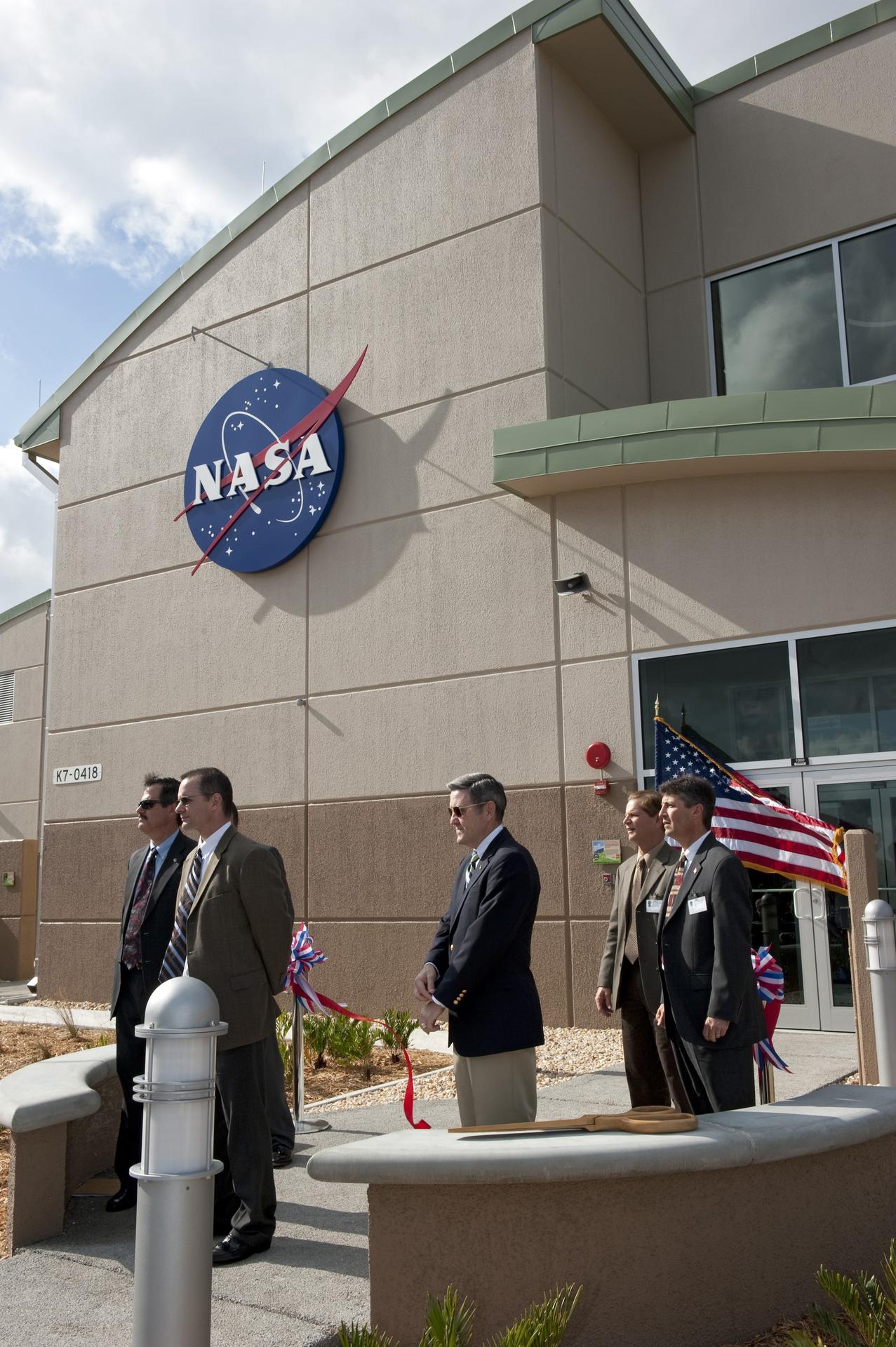 CAPE CANAVERAL, Fla. -- NASA's Kennedy Space Center in Florida hosts a ribbon-cutting ceremony for the space agency's most environmentally friendly facility, the Propellants North Administrative and Maintenance Facility in Kennedy's Launch Complex 39 area. From left, are Mike Benik, director of Kennedy's Center Operations; James Wright, deputy assistant administrator for the Office of Strategic Infrastructure at NASA Headquarters; Bob Cabana, Kennedy's center director; Ward Davis, president of HW Davis Construction Inc.; and Rick Ferreira, chief operating officer of Jones Edmunds and Associates Inc. Propellants North consists of two buildings, one to store cryogenic fuel transfer equipment and one to house personnel who support fueling spacecraft. The recently rebuilt buildings will be NASA's first carbon neutral facility, which means it will produce enough energy on site from renewable sources to offset what it requires to operate. The facility also will reach for the U.S. Green Building Council's Leadership in Environmental and Energy Design (LEED) Platinum status, which is the highest LEED rating. Photo credit: NASA/Kim Shiflett