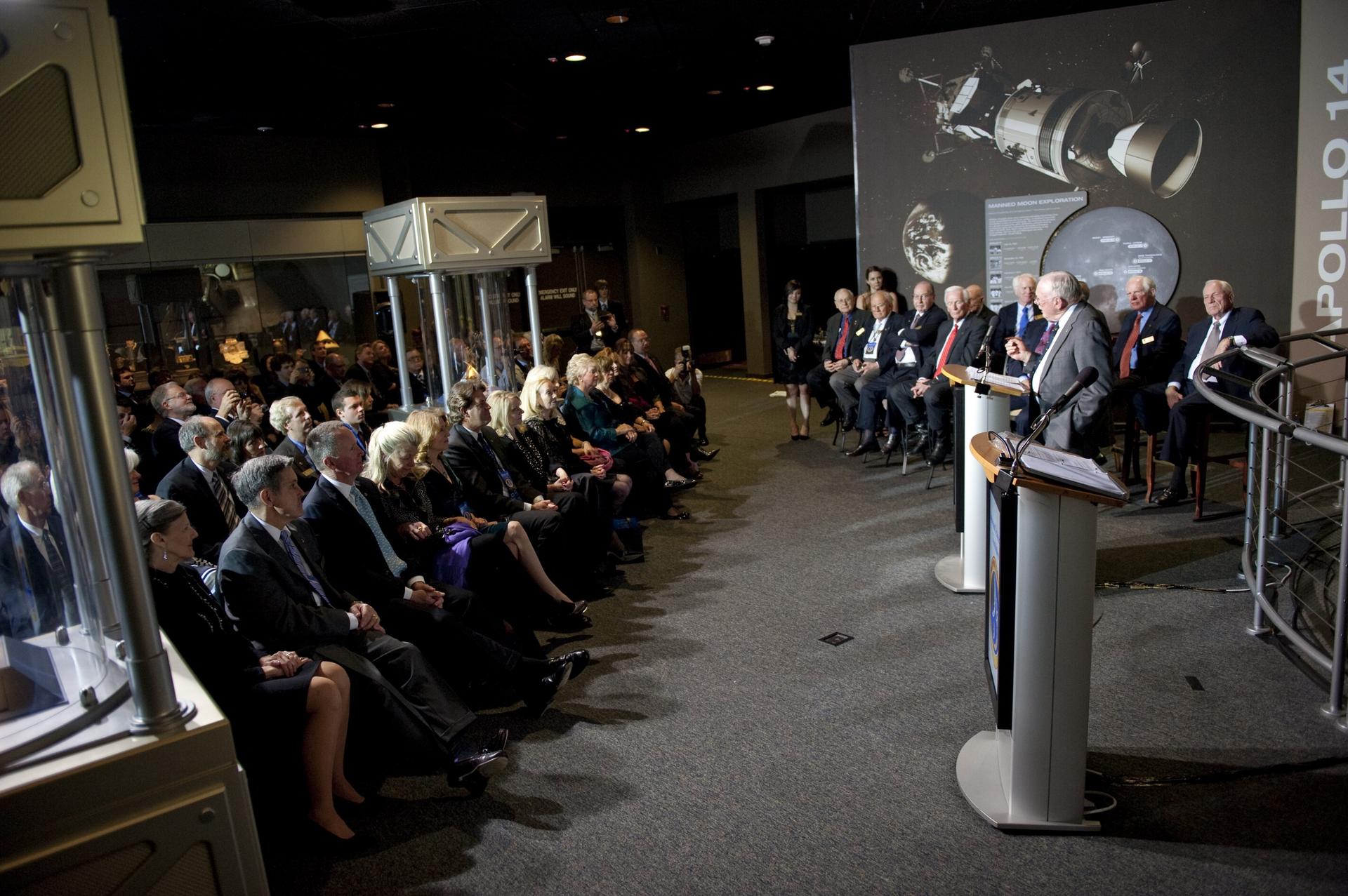 CAPE CANAVERAL, Fla. -- Apollo 11 Commander Neil Armstrong talks to attendees of the Apollo 14 Anniversary Soirée at the Kennedy Space Center Visitor Complex's Saturn V Center. The celebration was hosted by the Astronaut Scholarship Foundation. Apollo 14 landed on the lunar surface 40 years ago on Feb. 5, 1971. In 1969, Armstrong gained the distinction of being the first human to step foot on the surface of the moon. Photo credit: NASA/Kim Shiflett