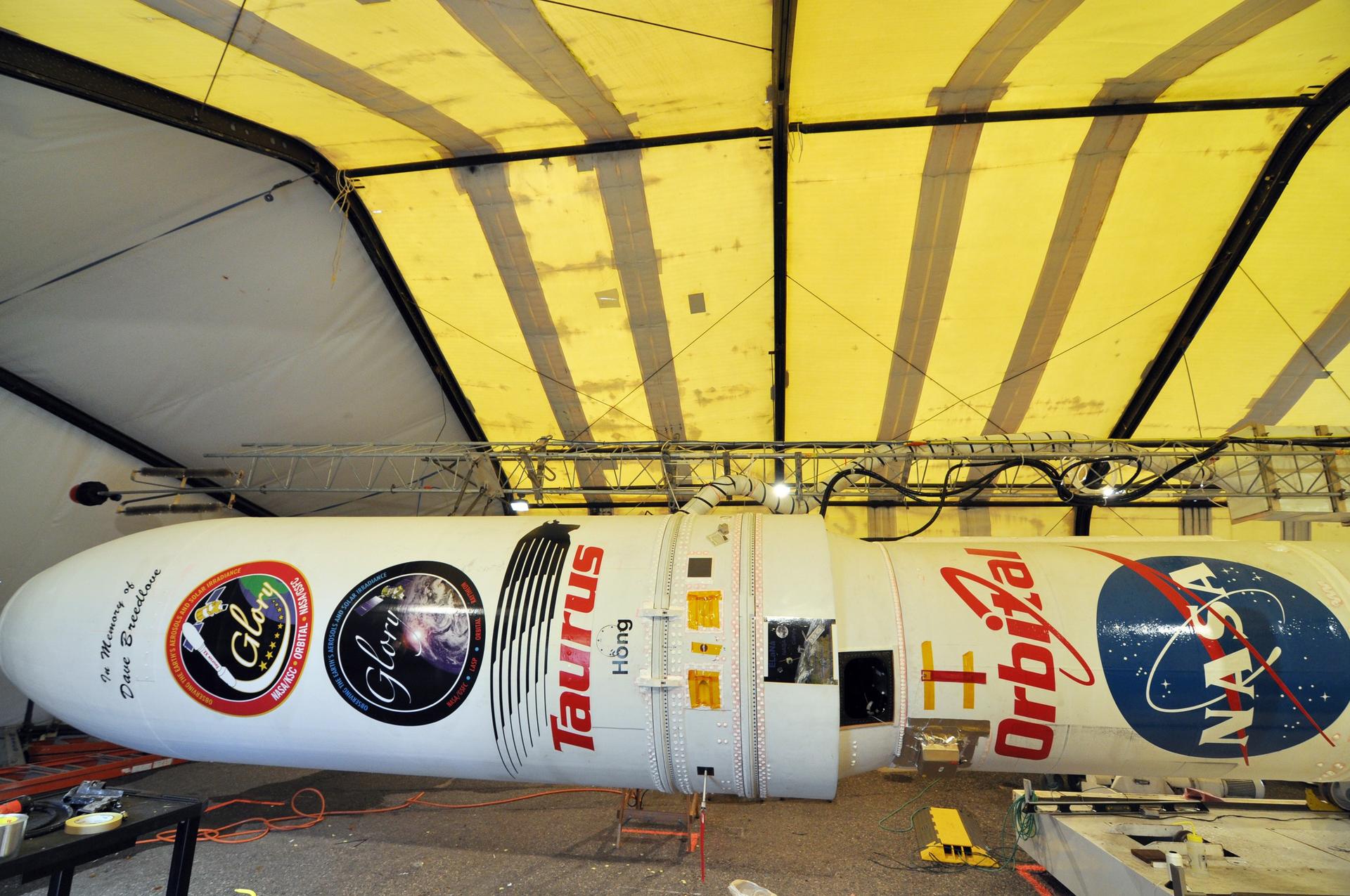 VANDENBERG AIR FORCE BASE, Calif. -- At Space Launch Complex 576-E at Vandenberg Air Force Base in California, NASA's Glory spacecraft, integrated with the upper stack of the Taurus rocket, displays mission decals including one in remembrance of Dave Breedlove who was a mission manager and long-time member of the Launch Services Program team. The vehicle is dedicated to his memory. The Orbital Sciences Corp. Taurus XL rocket will launch Glory into low Earth orbit. Once Glory reaches orbit, it will collect data on the properties of aerosols and black carbon. It also will help scientists understand how the sun's irradiance affects Earth's climate. Launch is scheduled for 5:09 a.m. EST Feb. 23. For information, visit www.nasa.gov/glory. Photo credit: NASA/Randy Beaudoin, VAFB