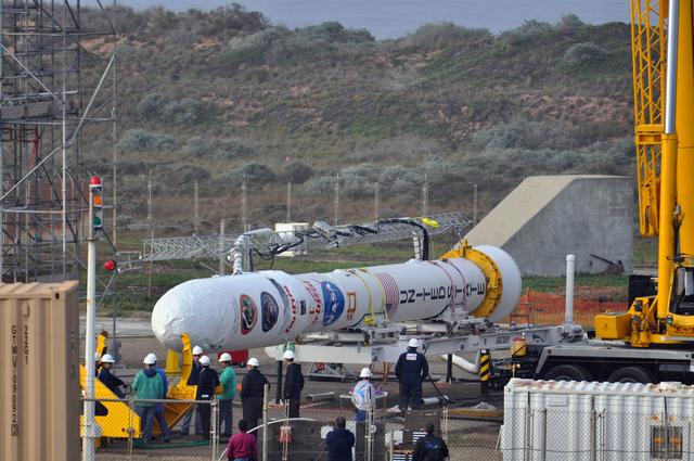 VANDENBERG AIR FORCE BASE, Calif. -- On Space Launch Complex 576-E at Vandenberg Air Force Base in California, Orbital Sciences workers prepare NASA's Glory upper stack for attachment to the Taurus XL rocket's Stage 0. The upper stack consists of Stages 1, 2 and 3 of the Taurus as well as the encapsulated Glory spacecraft. Workers put the non-flight environmental shield over the fairing prior to assembly. A portion of the umbilical tower is attached to the upper stack which falls away from the spacecraft during liftoff. The Orbital Sciences Taurus XL rocket will launch Glory into low Earth orbit. Once Glory reaches orbit, it will collect data on the properties of aerosols and black carbon. It also will help scientists understand how the sun's irradiance affects Earth's climate. Launch is scheduled for 5:09 a.m. EST Feb. 23. For information, visit www.nasa.gov/glory. Photo credit: NASA/Randy Beaudoin, VAFB