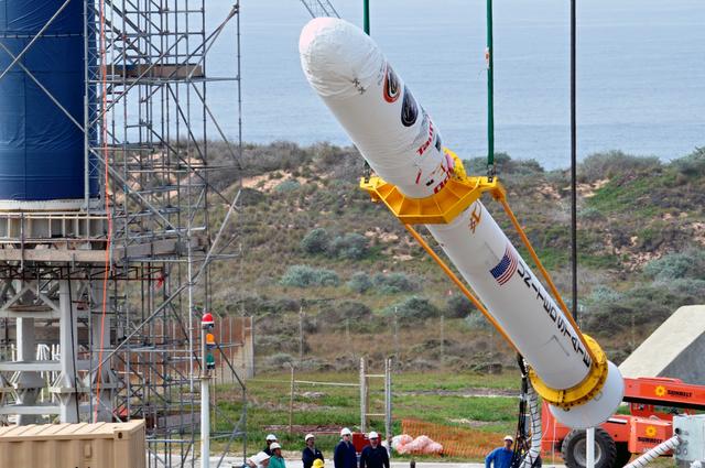 VANDENBERG AIR FORCE BASE, Calif. -- On Space Launch Complex 576-E at Vandenberg Air Force Base in California, Orbital Sciences workers monitor NASA's Glory upper stack as a crane lifts it from a stationary rail for attachment to the Taurus XL rocket's Stage 0. The upper stack consists of Stages 1, 2 and 3 of the Taurus as well as the encapsulated Glory spacecraft. Workers put the non-flight environmental shield over the fairing prior to assembly. The Orbital Sciences Taurus XL rocket will launch Glory into low Earth orbit. Once Glory reaches orbit, it will collect data on the properties of aerosols and black carbon. It also will help scientists understand how the sun's irradiance affects Earth's climate. Launch is scheduled for 5:09 a.m. EST Feb. 23. For information, visit www.nasa.gov/glory. Photo credit: NASA/Randy Beaudoin, VAFB