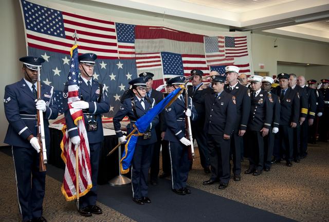 CAPE CANAVERAL, Fla. -- Members of the United States Air Force 45th Space Wing Honor Guard and more than a dozen 9/11 first responders take part in "The National 9/11 Flag" stitching ceremony in the Debus Conference Facility at the Kennedy Space Center Visitor Complex in Florida. The contributions of NASA, Kennedy Space Center and the state of Florida were stitched into the fabric of the American Flag, which was recovered near ground zero following the World Trade Center attacks on Sept. 11, 2001. The "New York Says Thank You Foundation" is taking the flag on a cross-country journey to be restored to its original 13-stripe design using pieces of fabric from American flags destined for retirement in all 50 states. Once the flag is restored, it will become a permanent collection of the National September 11 Memorial Museum being built at the World Trade Center site. Photo credit: NASA/Kim Shiflett