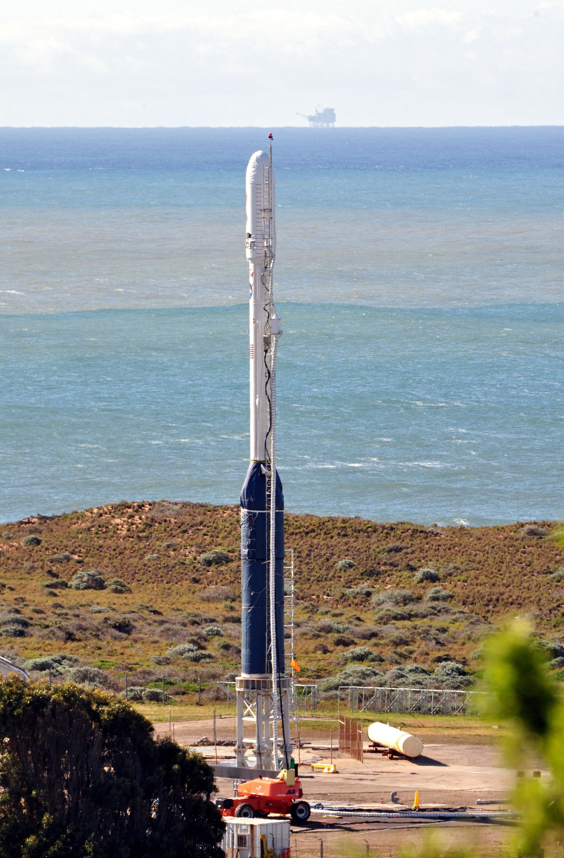 VANDENBERG AIR FORCE BASE, Calif. -- On Space Launch Complex 576-E at Vandenberg Air Force Base in California, the Taurus XL rocket is in its launch configuration. The upper stack, consisting of Stages 1, 2 and 3, as well as the encapsulated Glory spacecraft, is attached to an interstage and Stage 0 at the launch pad. The Orbital Sciences Taurus XL rocket will launch Glory into low Earth orbit. Once Glory reaches orbit, it will collect data on the properties of aerosols and black carbon. It also will help scientists understand how the sun's irradiance affects Earth's climate. Launch is scheduled for 5:09 a.m. EST Feb. 23. For information, visit www.nasa.gov/glory. Photo credit: NASA/Randy Beaudoin, VAFB