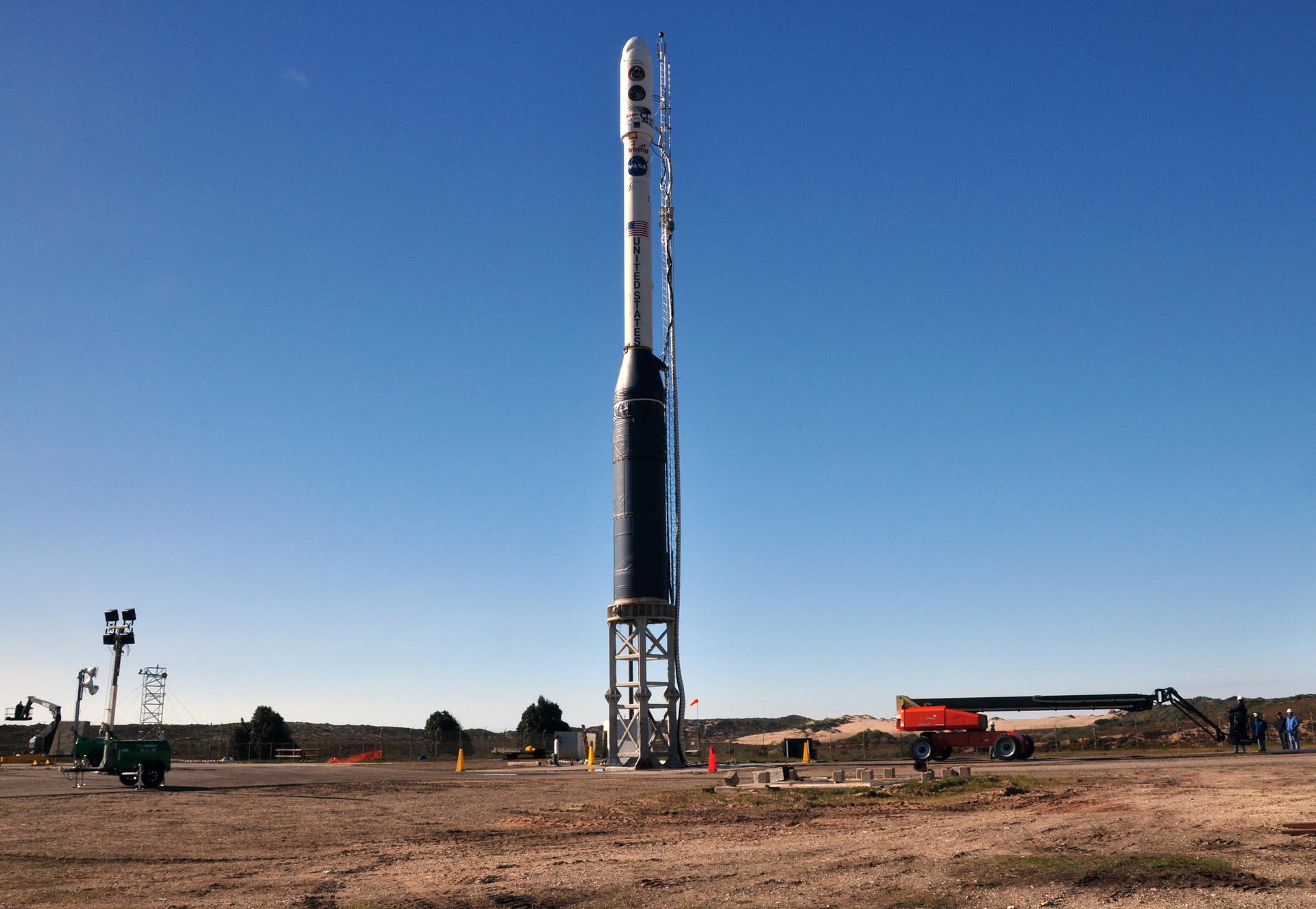 VANDENBERG AIR FORCE BASE, Calif. -- On Space Launch Complex 576-E at Vandenberg Air Force Base in California, the Taurus XL rocket is in its launch configuration. The upper stack, consisting of Stages 1, 2 and 3, as well as the encapsulated Glory spacecraft, is attached to an interstage and Stage 0 at the launch pad. The umbilical tower attached to the upper stack will fall away from the spacecraft during liftoff. The Orbital Sciences Taurus XL rocket will launch Glory into low Earth orbit. Once Glory reaches orbit, it will collect data on the properties of aerosols and black carbon. It also will help scientists understand how the sun's irradiance affects Earth's climate. Launch is scheduled for 5:09 a.m. EST Feb. 23. For information, visit www.nasa.gov/glory. Photo credit: NASA/Randy Beaudoin, VAFB