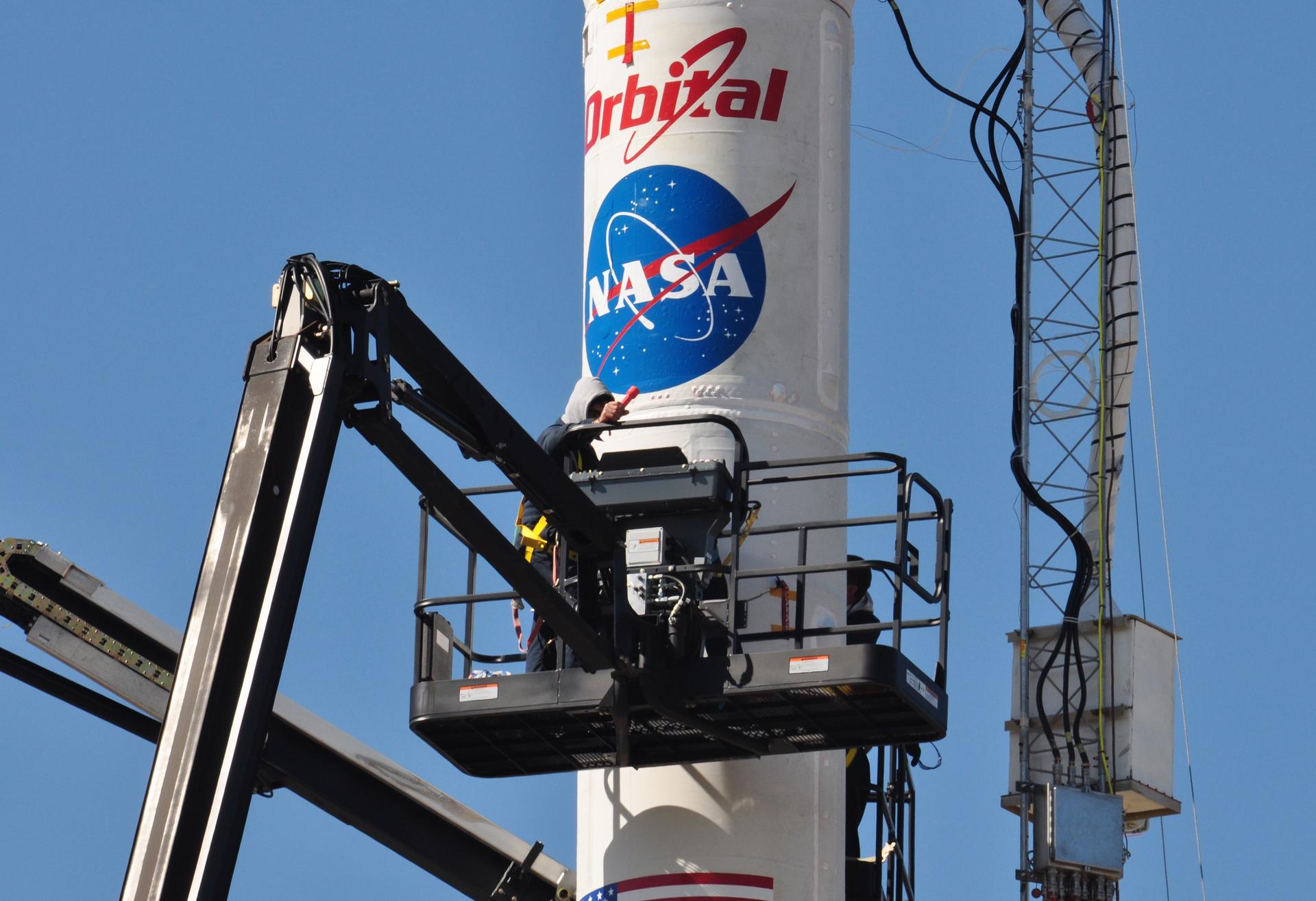 VANDENBERG AIR FORCE BASE, Calif. -- On Space Launch Complex 576-E at Vandenberg Air Force Base in California, workers in a bucket conduct closeout procedures on the Taurus XL rocket in preparations for liftoff. The umbilical tower attached to the upper stack will fall away from the spacecraft during launch. The Orbital Sciences Taurus XL rocket will launch Glory into low Earth orbit. Once Glory reaches orbit, it will collect data on the properties of aerosols and black carbon. It also will help scientists understand how the sun's irradiance affects Earth's climate. Launch is scheduled for 5:09 a.m. EST Feb. 23. For information, visit www.nasa.gov/glory. Photo credit: NASA/Randy Beaudoin, VAFB