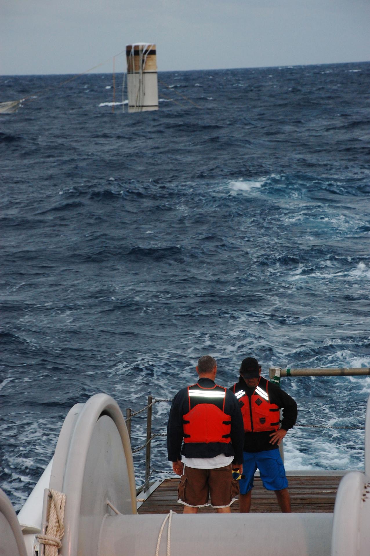 CAPE CANAVERAL, Fla. -- Part of a spent booster is seen in the background bobbing in the Atlantic Ocean as deck hands on Freedom Star, one of NASA's solid rocket booster retrieval vessel prepare to recover it after space shuttle Discovery's STS-133 launch. The shuttle’s two solid rocket booster casings and associated flight hardware are recovered in the Atlantic Ocean after every launch by Liberty Star and Freedom Star. The boosters impact the Atlantic about seven minutes after liftoff and the retrieval ships are stationed about 10 miles from the impact area at the time of splashdown. After the spent segments are processed, they will be transported to Utah, where they will be refurbished and stored, if needed. Photo credit: NASA/Ben Smegelsky