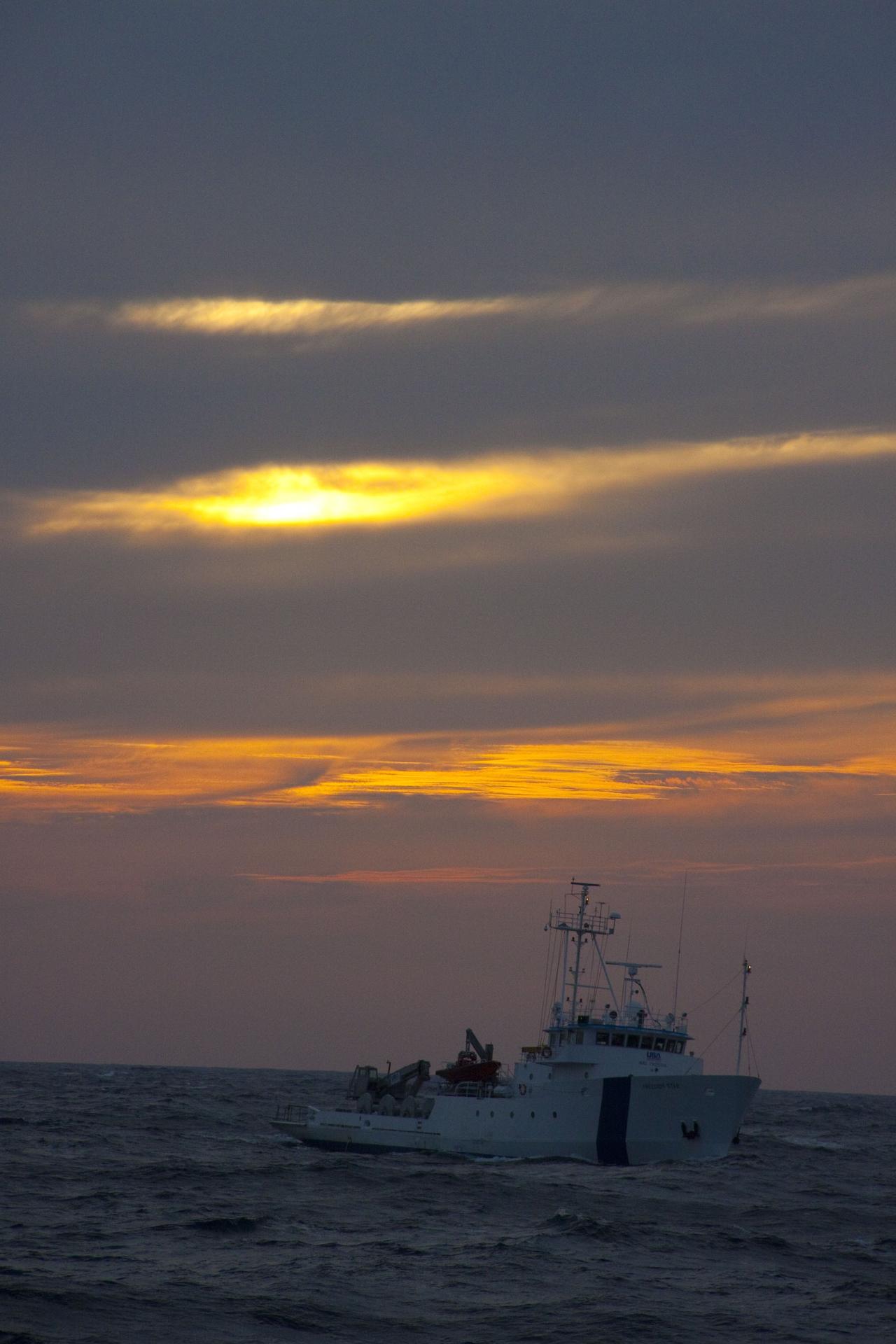 CAPE CANAVERAL, Fla. -- Dusk descends on the Freedom Star, one of NASA's solid rocket booster retrieval ships stationed in the Atlantic Ocean, to recover the right spent booster after it splashed down following space shuttle Discovery's final launch. The shuttle’s two solid rocket booster casings and associated flight hardware are recovered in the Atlantic Ocean after every launch by Freedom Star and Liberty Star. The boosters impact the Atlantic about seven minutes after liftoff and the retrieval ships are stationed about 10 miles from the impact area at the time of splashdown. After the spent segments are processed, they will be transported to Utah, where they will be refurbished and stored, if needed. Photo credit: NASA/Frank Michaux