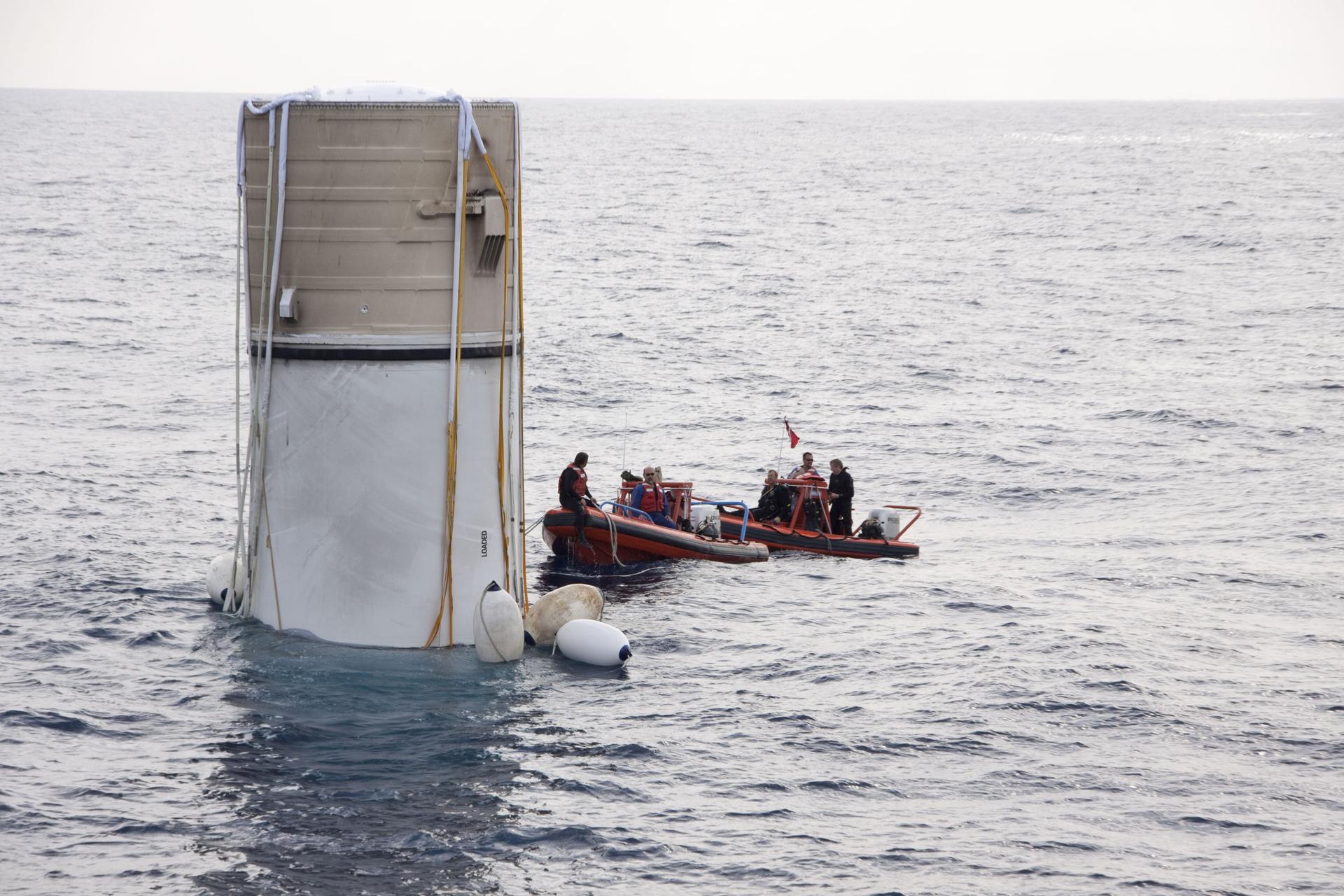 CAPE CANAVERAL, Fla. -- Crew members in a skiff from Liberty Star, one of NASA's solid rocket booster retrieval ships, attach flotation devices, or buoys, to the parachute lines from the right spent booster from space shuttle Discovery's final launch. The shuttle's two solid rocket booster casings and associated flight hardware are recovered in the Atlantic Ocean after every launch by Freedom Star and Liberty Star. The boosters impact the Atlantic about seven minutes after liftoff and the retrieval ships are stationed about 10 miles from the impact area at the time of splashdown. After the spent segments are processed, they will be transported to Utah, where they will be refurbished and stored, if needed. Photo credit: NASA/Frank Michaux